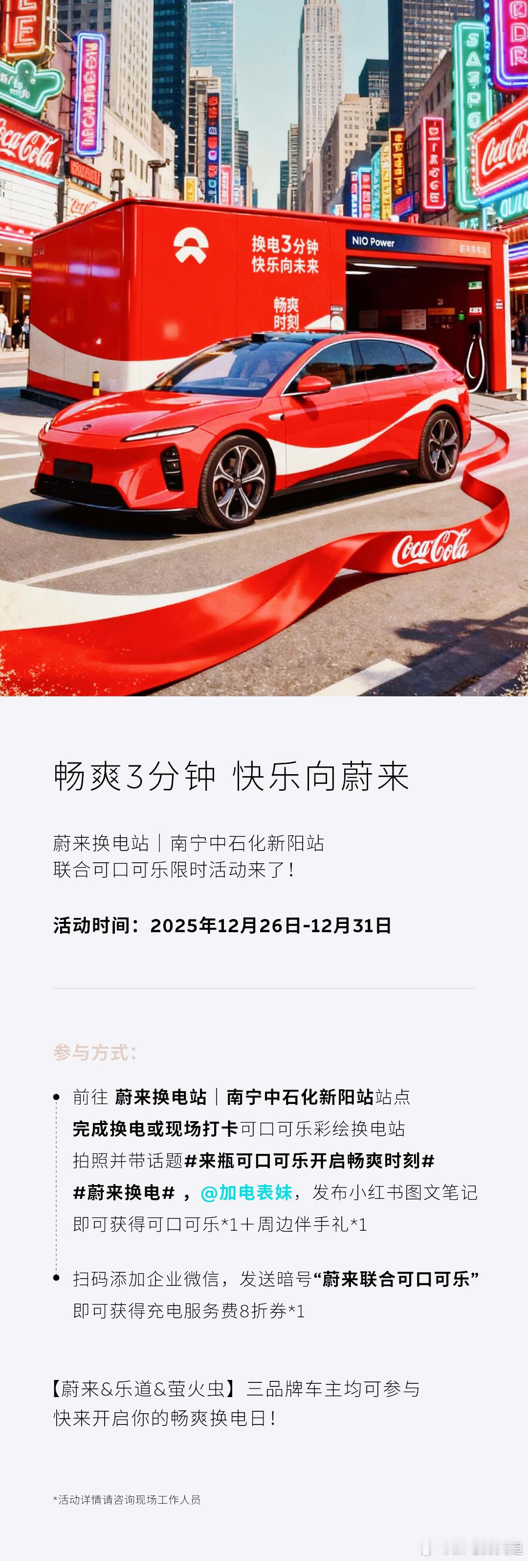 🎉蔚来联合可口可乐限定活动南宁站开启参与活动打卡限定彩绘换电站,体验3分钟换电的补能畅爽时刻⚡️📍 蔚来换电站|南宁中石化新阳站 邀您一起加电,即刻充乐!