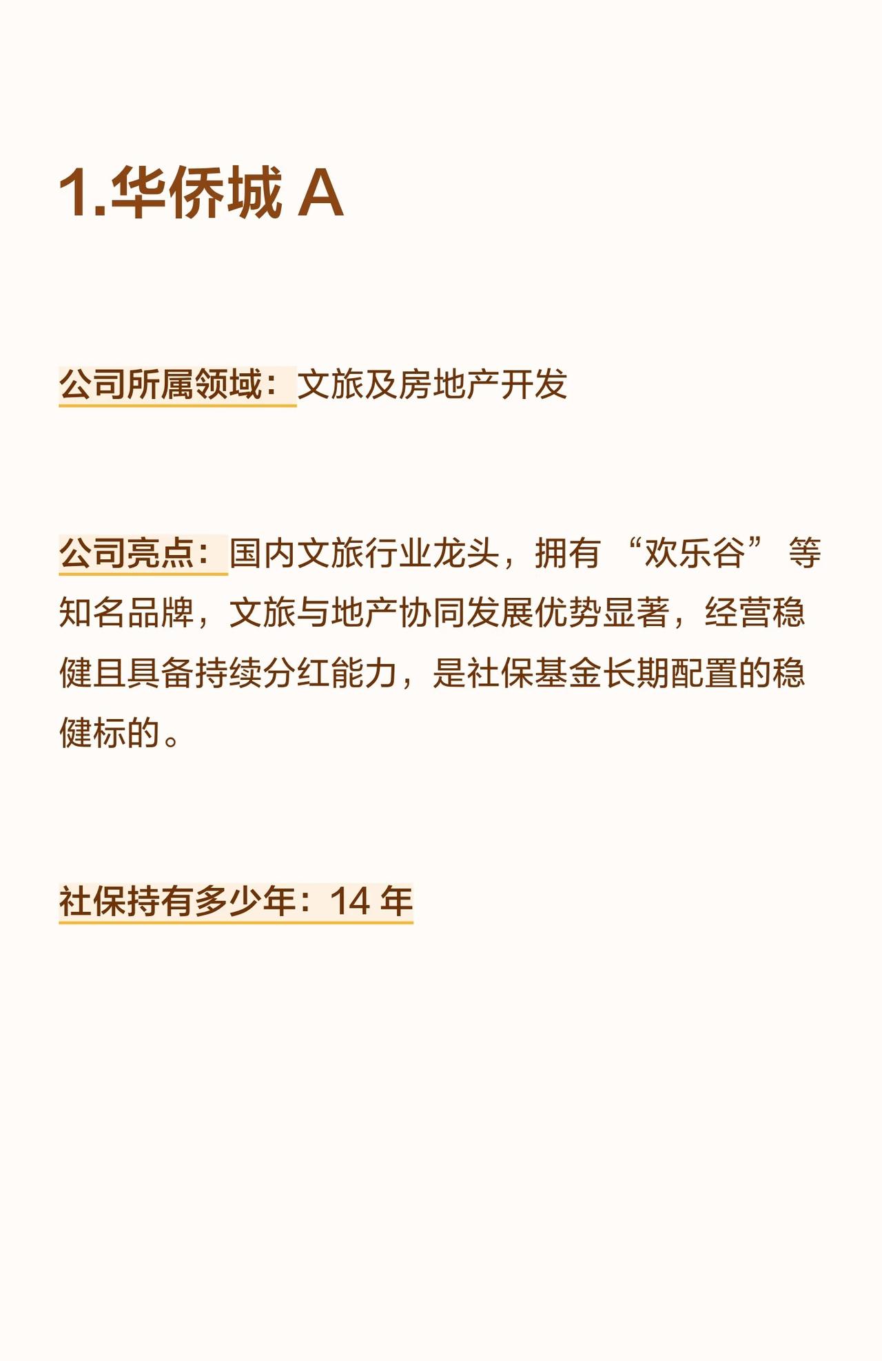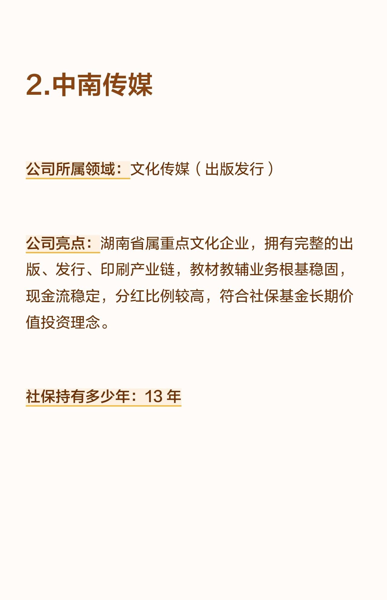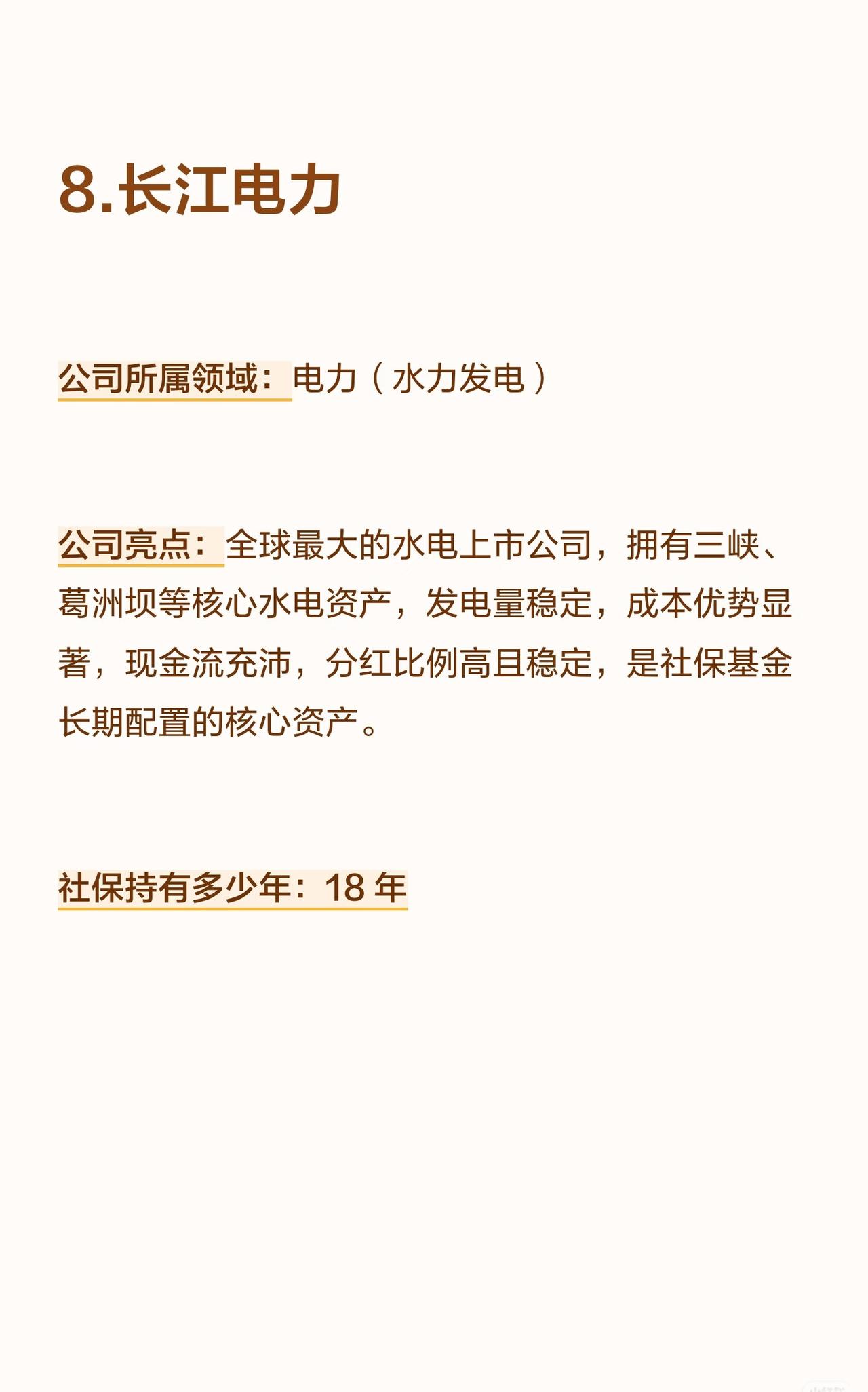社保基金长期重仓的A股8家公司信息如下: 社保持有超10年的A股8家公司涵盖文旅、化工、电力、文化传媒、食品加工等领域,均为业绩稳健、分红持续的优质企业。 1. 华侨城A:所属文旅及房地产开发领域,是国内文旅行业龙头,拥有“欢乐谷”等知名品牌,文旅与地产协同发展优势显著,经营稳健且具持续分红能力,社保持有14年。 2. 中南传媒:所属文化传媒(出版发行)领域,是湖南省属重点文化企业,拥有完整的出版、发行、印刷产业链,教材教辅业务根基稳固,现金流稳定,分红比例较高,社保持有13年。 3. 华鲁恒升:所属基础化工领域,是国内煤头化工龙头企业,产业链一体化优势明显,产品覆盖化肥、化工新材料等多个领域,抗周期能力强,业绩增长稳定,长期获社保基金多组合重仓,社保持有13年。 4. 中原传媒:所属文化传媒(出版发行)领域,是河南省文化产业龙头,主营业务涵盖图书出版、报刊发行、教育服务等,区域市场壁垒高,经营业绩稳定,分红政策持续,社保持有11年。 5. 扬农化工:所属农药化工领域,是国内菊酯类农药绝对龙头,拥有全球领先的菊酯产能,产品高效低毒、技术壁垒高,海外市场拓展良好,净利润持续增长,社保持有11年。 6. 申能股份:所属电力及能源领域,是上海市属能源龙头,业务覆盖电力、燃气、煤炭等,能源保供能力突出,经营稳健,股息率较高,社保持有16年。 7. 双汇发展:所属食品加工(肉类制品)领域,是国内肉类加工龙头,品牌知名度高,产业链完善(从养殖到屠宰、加工、销售一体化布局),抗风险能力强,业绩与分红稳定,社保持有17年。 8. 长江电力:所属电力(水力发电)领域,是全球最大的水电上市公司,拥有三峡、葛洲坝等核心水电资产,发电量稳定、成本优势显著、现金流充沛,分红比例高且稳定,社保持有18年。