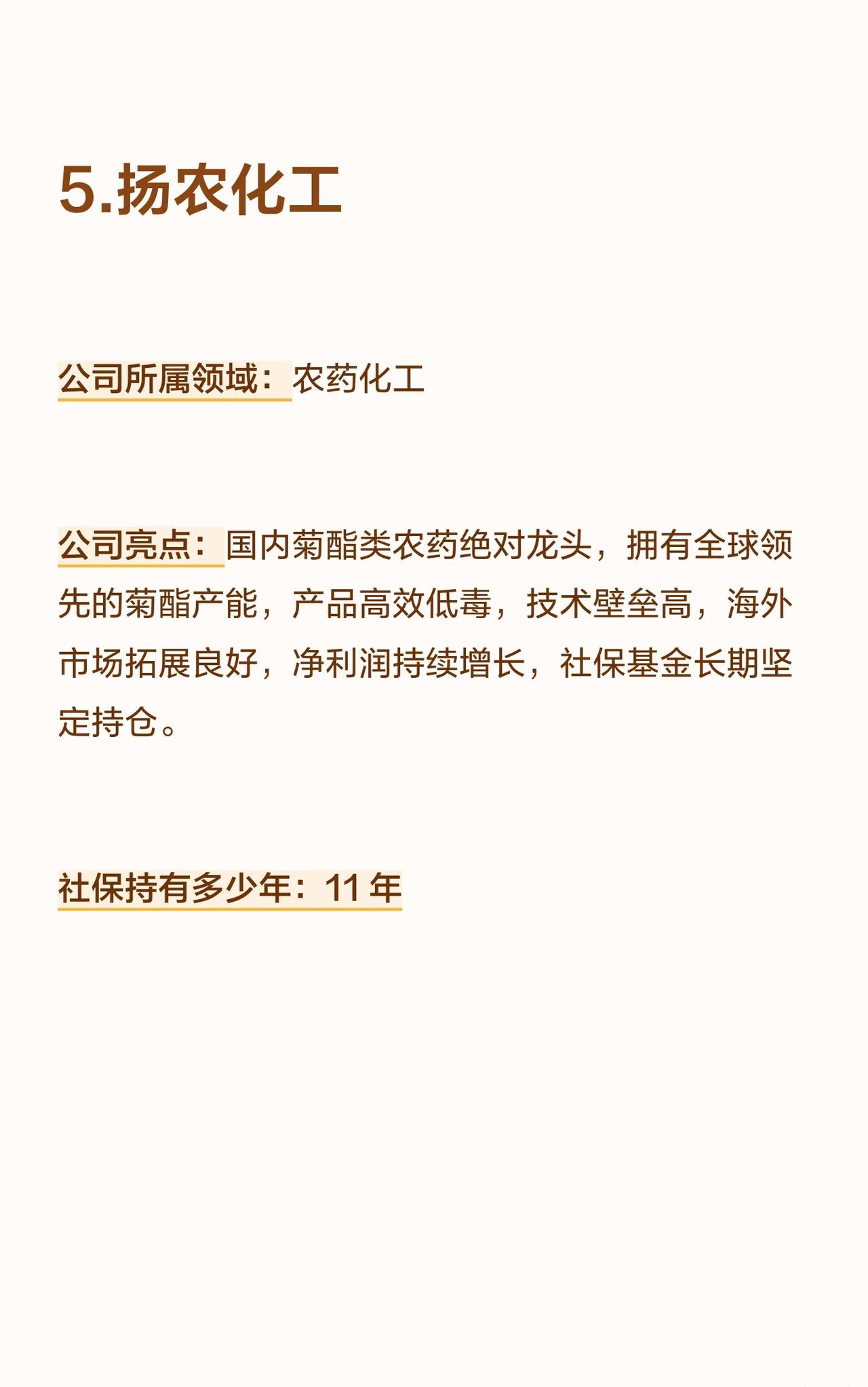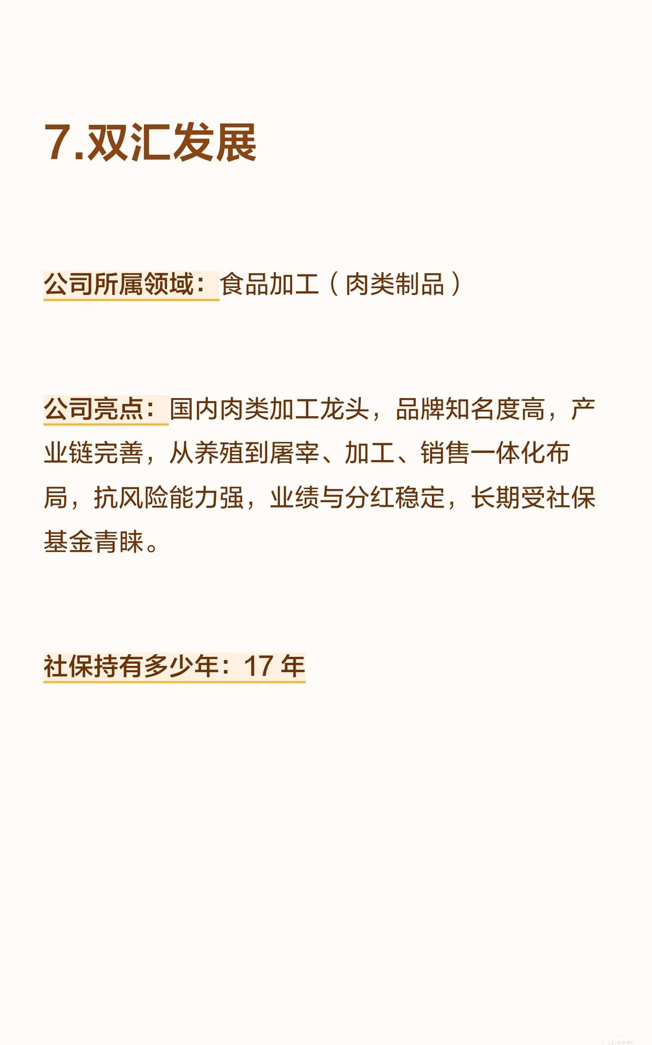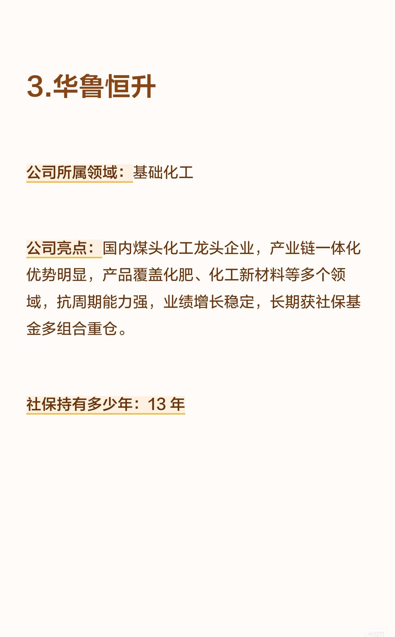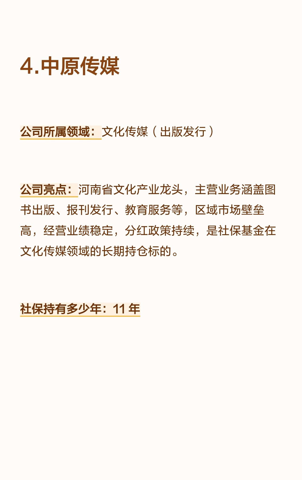 社保基金长期重仓的A股8家公司信息如下: 社保持有超10年的A股8家公司涵盖文旅、化工、电力、文化传媒、食品加工等领域,均为业绩稳健、分红持续的优质企业。 1. 华侨城A:所属文旅及房地产开发领域,是国内文旅行业龙头,拥有“欢乐谷”等知名品牌,文旅与地产协同发展优势显著,经营稳健且具持续分红能力,社保持有14年。 2. 中南传媒:所属文化传媒(出版发行)领域,是湖南省属重点文化企业,拥有完整的出版、发行、印刷产业链,教材教辅业务根基稳固,现金流稳定,分红比例较高,社保持有13年。 3. 华鲁恒升:所属基础化工领域,是国内煤头化工龙头企业,产业链一体化优势明显,产品覆盖化肥、化工新材料等多个领域,抗周期能力强,业绩增长稳定,长期获社保基金多组合重仓,社保持有13年。 4. 中原传媒:所属文化传媒(出版发行)领域,是河南省文化产业龙头,主营业务涵盖图书出版、报刊发行、教育服务等,区域市场壁垒高,经营业绩稳定,分红政策持续,社保持有11年。 5. 扬农化工:所属农药化工领域,是国内菊酯类农药绝对龙头,拥有全球领先的菊酯产能,产品高效低毒、技术壁垒高,海外市场拓展良好,净利润持续增长,社保持有11年。 6. 申能股份:所属电力及能源领域,是上海市属能源龙头,业务覆盖电力、燃气、煤炭等,能源保供能力突出,经营稳健,股息率较高,社保持有16年。 7. 双汇发展:所属食品加工(肉类制品)领域,是国内肉类加工龙头,品牌知名度高,产业链完善(从养殖到屠宰、加工、销售一体化布局),抗风险能力强,业绩与分红稳定,社保持有17年。 8. 长江电力:所属电力(水力发电)领域,是全球最大的水电上市公司,拥有三峡、葛洲坝等核心水电资产,发电量稳定、成本优势显著、现金流充沛,分红比例高且稳定,社保持有18年。
