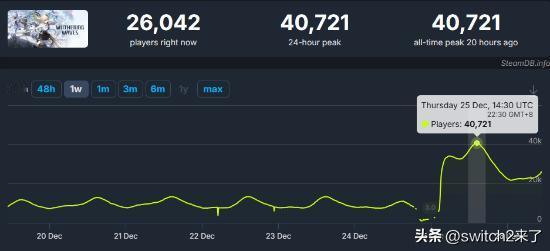 国产开放世界动作游戏《鸣潮》于12月25日更新3.0版本,让Steam同时在线数创下新纪录! SteamDB数据显示,在12月25日晚22点30分,同时在线峰值达到40721人,超越此前任何一次版本更新时的玩家数量。 另外,《鸣潮》也进入Steam全球及多个国家/地区的热销榜,在亚洲和欧美都名列前茅,证明全球有不少玩家都爱玩!