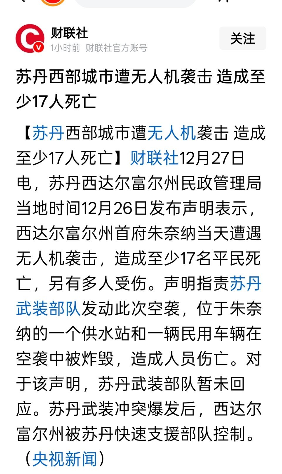 苏丹西部城市遭无人机袭击,造成至少17人死亡