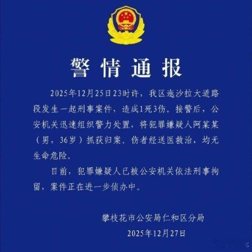 攀枝花发生刑案致1死3伤好好的居然发生这样的事,1死3伤,想想都后怕。逝者太可惜了,希望受伤的都能平安治好,凶手必须严惩不贷,给受害者一个交代