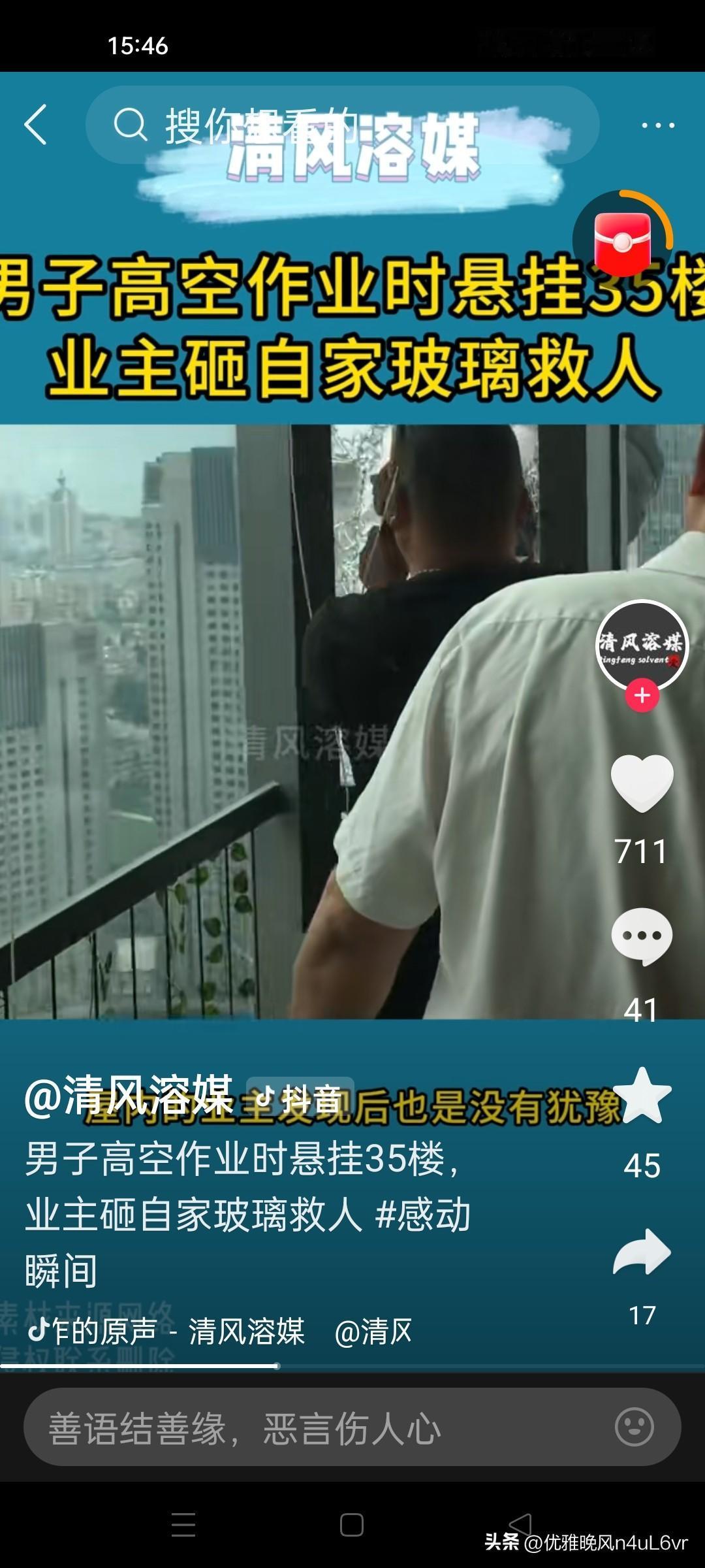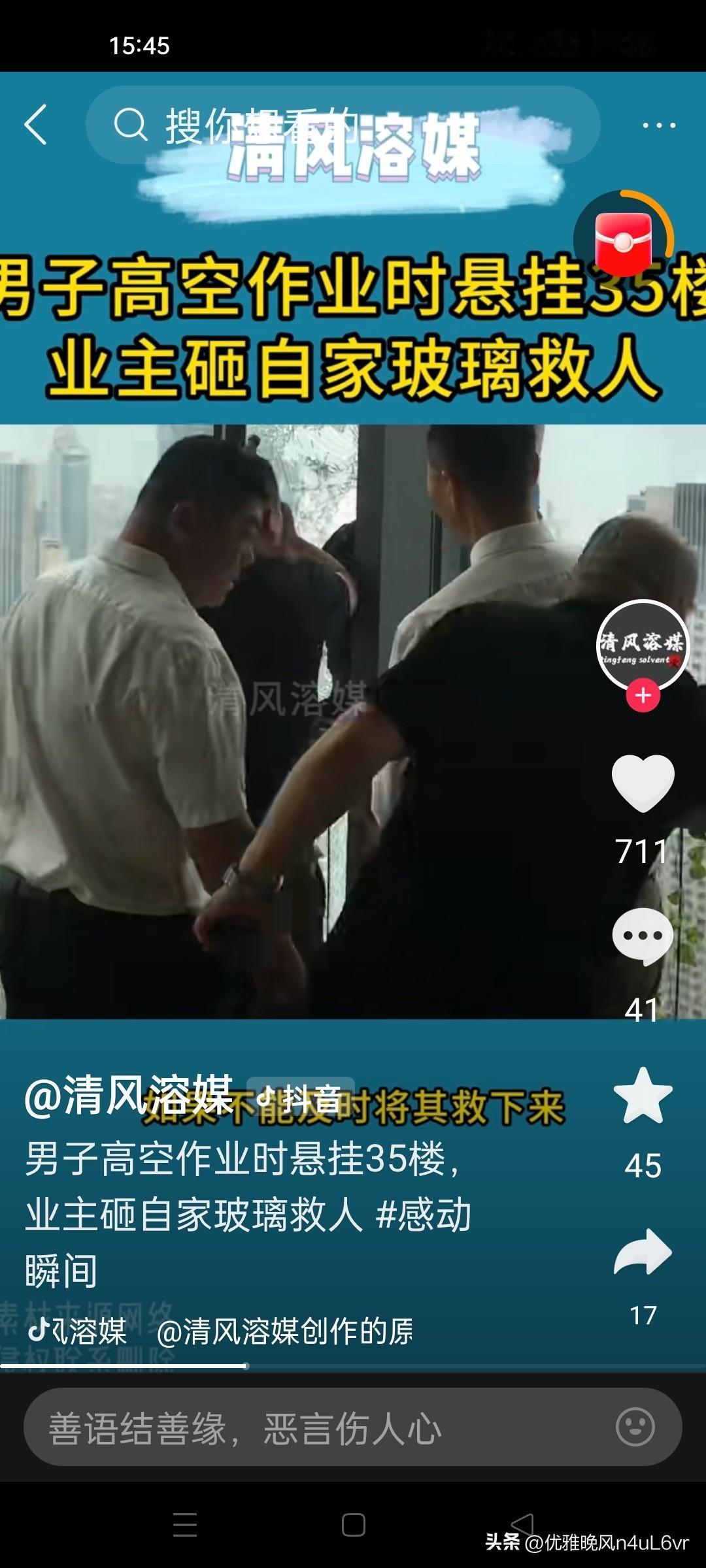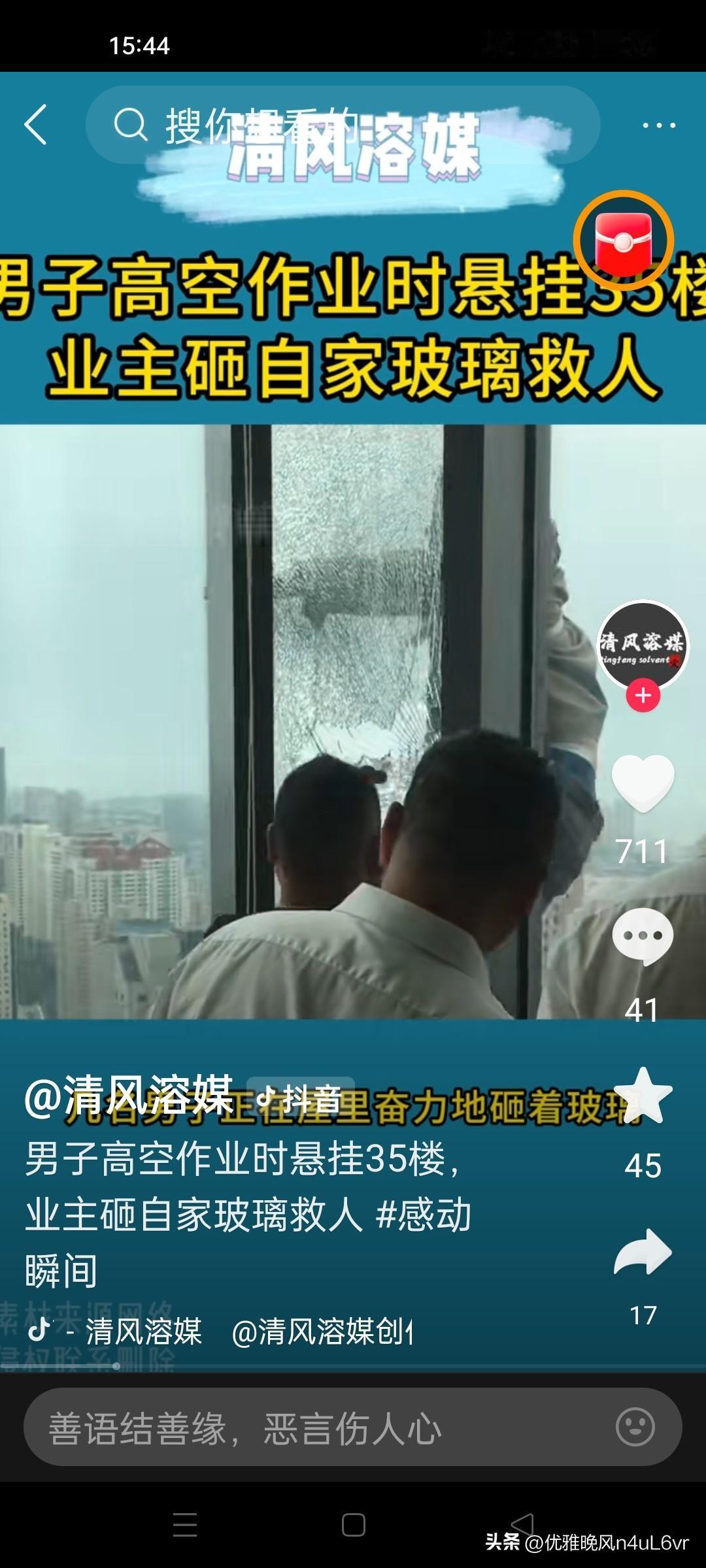 高空作业人员突发意外,正个人旋挂在35楼外,人处于昏迷状态,35楼主人亲自动手砸窗户玻璃,最后在大家一起努力下,高空作业人员救下来了。人们悬着的心才放下。