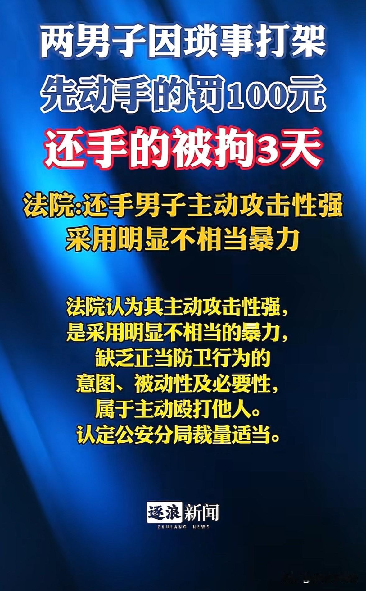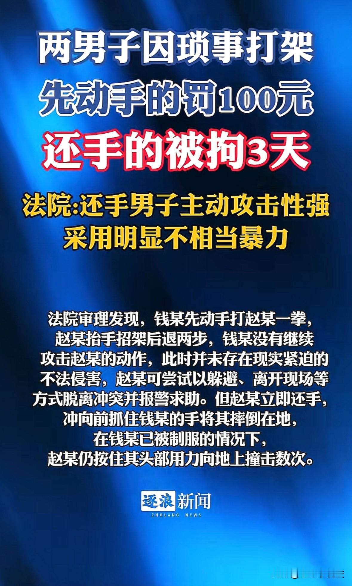 广西柳州,男子与隔壁店铺老板发生争执,男子气不过推倒隔壁的货,隔壁老板抬手朝着男子打了一拳,随后双方就打了起来。报警后,双方不能就赔偿数额达成一致,隔壁老板鉴定为轻微伤,警方就以男子殴打他人为由处以行政拘留3日处罚,对隔壁老板罚款100元。男子不服处罚,认为先动手的是隔壁老板,自己还手算自卫,起诉至法院,法院判决引发热议! 赵某和钱某同在一个市场里做生意,而且还是邻居,平日里是抬头不见低头见,免不了经常发生摩擦,平日里积累下来的矛盾也不少。 在2024年4月,赵某闲来无事在自家店铺门前闲逛,看到钱某的门脸里满满当当的客人,心里生气,就把钱某顾客的手推车推到了远处。 钱某店铺的顾客买完东西找不到手推车,往远处望去才发现手推车被推走,就跟钱某告状。 钱某不用看监控都知道是谁做的,于是就和赵某争执了起来。两个人争吵的很激烈,你一言我一语互不退让。 本来不大点的事,但是一翻起旧账来就气不打一处来,赵某一气之下就把钱某的货品推倒了,货品散落一地。 钱某也不是怕事的人,抬起胳膊就朝着赵某挥了一拳。赵某被实实在在的打了一拳,虽然抬手招架了一下,但还是退后了两步。 赵某火气腾一下就燃了起来,抓着钱某的手把钱某摔倒在地上,然后用力将钱某的头朝着地上撞击。 钱某奋力反抗,反抗了很久,赵某才松开了钱某。钱某马上掏出手机报警,警方赶到后控制了局面,并让头部受伤的钱某先去治疗,然后再进行处置。 钱某到医院救治后,做了鉴定,损伤程度鉴定为轻微伤。钱某拿着鉴定书来到公安分局,看看赵某得赔多少钱。 赵某看了一眼鉴定结果,不以为然,虽然受伤的是钱某,但是赵某并没打算赔偿多少,而钱某要的价格又挺高的,双方就赔偿的金额争吵半天也没有达成一致。 警方本着调解的方向在劝说两个人,但是两个人还是互不相让,没有办法,警方只能按照规定对两个人做出处罚。 根据《治安管理处罚法》第43条的规定:殴打他人的,或者故意伤害他人身体的,处五日以上十日以下拘留,并处二百元以上五百元以下罚款;情节较轻的,处五日以下拘留或者五百元以下罚款。 有下列情形之一的,处十日以上十五日以下拘留,并处五百元以上一千元以下罚款: (一)结伙殴打、伤害他人的; (二)殴打、伤害残疾人、孕妇、不满十四周岁的人或者六十周岁以上的人的; (三)多次殴打、伤害他人或者一次殴打、伤害多人的。 钱某受伤,有鉴定结果为证,因此警方认定赵某殴打了钱某,致其受伤,对赵某处以行政拘留3日的处罚。 钱某是先动手的一方,没有钱某的动手也不会有后续的殴打,因此警方对钱某处以罚款100元的处罚。 警方做出处罚后赵某不服,先动手的没被处罚,反而是他为了保护自己还手的被罚,认为警方处罚的不合理,起诉至法院。 根据《行政诉讼法》第46条的规定:公民、法人或者其他组织直接向人民法院提起诉讼的,应当自知道或者应当知道作出行政行为之日起六个月内提出。法律另有规定的除外。 赵某认为警方处罚的不合理,诉求撤销处罚。赵某主张与钱某发生动手的行为属于自卫,并非是殴打,所以不应该对其处以行政拘留3日的处罚。 反而是钱某,在双方发生口角后动了手,是升级双方矛盾的主要诱因,但是钱某却只被罚款100元,赵某认为不合理。 法院审理后认为: 赵某与钱某发生争执是因为赵某将钱某的顾客手推车推到了远处,赵某首先就存在过错。 在双方发生口角争执的时候,赵某还将钱某的货品推翻,激发了双方的矛盾,让矛盾升级,赵某也存在过错。 虽然钱某先动手打了赵某,但是赵某抬手招架并退后2步,钱某并没有继续追上去对赵某进行殴打,钱某不存在对赵某实施了紧迫的不法侵害。 赵某可以躲避钱某的殴打或者是报警处理,但是赵某却立即还手,将钱某按在地上撞击头部。 根据《刑法》第20条的规定:为了使国家、公共利益、本人或者他人的人身、财产和其他权利免受正在进行的不法侵害,而采取的制止不法侵害的行为,对不法侵害人造成损害的,属于正当防卫,不负刑事责任。 正当防卫明显超过必要限度造成重大损害的,应当负刑事责任,但是应当减轻或者免除处罚。 钱某被赵某控制住后,赵某依旧对钱某实施了殴打的行为,主动攻击性强,采用了明显不相当的暴力,缺乏正当防卫的意图和必要性,属于主动殴打他人。 双方因琐事产生矛盾进而动手,双方都存在过错。钱某虽然受伤,但是属于轻微伤。 因此警方认定赵某殴打他人属于情节较轻的情形,对赵某处以行政拘留3日的处罚,裁量适当,驳回赵某的诉讼请求。