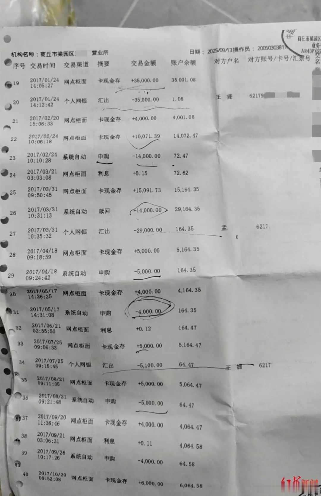 奇闻:银行女经理自杀储户千万存款被转走,儿子要结婚,去银行取款被告知“理财经理死了”取不出钱,78万存款账户只剩4000多元。今年4月18日上午10点多,丽丽和家人到邮储银行商丘市梁园区汇聚路营业所取款,工作人员把她叫到里面的办公室,称“王某珊死了”,又让其打印银行流水。银行流水打印出来后,丽丽懵了:78万存款只剩下4519元零4分。原来这些钱居然被理财经理转走了。据记者不完全统计,有12个账户超1000万存款被王某姗转走,金额最高265万元,最低2万元。看来,这家银行也是草台班子。现在客户帐上的钱没了,理财经理也S了,储户的钱该找谁要?日常