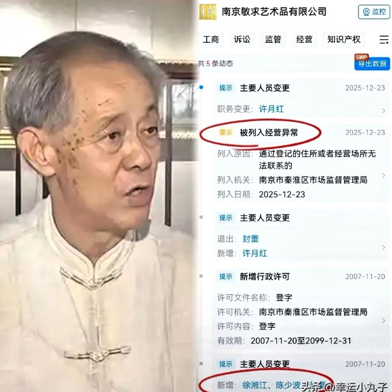南京博物院原院长徐湖平,曾凭借卓越的管理才能与深厚学术造诣广受认可,是推动南京文化事业发展的重要人物之一。 近日有消息称,徐湖平正接受相关部门核查,其个人发展与公众声誉因此受到极大影响。 备受关注的是,徐湖平之子徐湘江名下的南京敏求艺术品有限公司(敏求艺术),目前已出现经营异常情况。 据知情人士透露,敏求艺术此前发展势头较好,能在短时间内快速成长,多得益于徐湖平任职南京博物院期间积累的人脉与资源,堪称“父荣子贵”的典型写照。 徐湖平接受核查后,作为敏求艺术法定代表人的徐湘江处境尴尬,既要承受父亲相关事件带来的舆论压力,又要应对公司经营异常的难题,其工作与生活均受到不小影响。 引发外界热议的是,敏求艺术经营异常后,有传言称徐湘江在相关情况出现前连夜搬空了公司展厅与办公室,这一说法被不少人解读为反常之举。 毕竟正常情况下,企业遭遇经营问题理应积极应对,而非采取此类仓促举动,这也让外界对敏求艺术的经营情况产生诸多质疑。 这一事件,再次印证了“父荣子贵、父败子牵”的现实写照。无论官场还是商界,人脉与资源固然能提供助力,但一旦触碰规则底线,即便手握背景也无法置身事外,其家属子女往往也会受到波及,承受舆论的审视与讨论。 徐湖平、徐湘江父子的遭遇令人感慨,人生起落无常,一念之差便可能改变命运轨迹。希望相关人员能积极配合核查工作,推动真相水落石出,也期待社会各界能基于事实,给出客观公正的评判。 网友纷纷评论: 从风光无限到身陷风波,徐湖平父子的经历警醒大家,莫借权力为家人谋便利,守规矩、知敬畏,才是做人做事最稳当的底线。