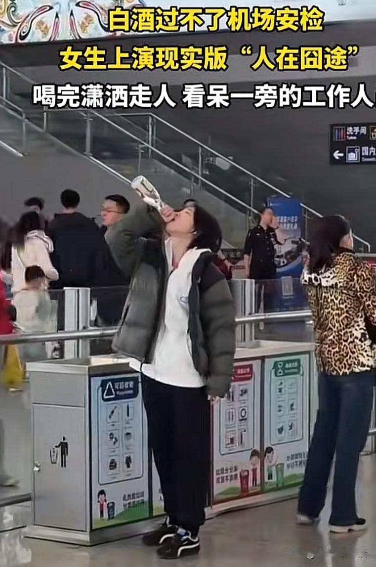 安检遇白酒?硬核操作看傻保安! 安检拦了白酒不让带,有人直接当场吹瓶,这操作妥妥的横!女子去机场安检的时候被拦下白酒,不甘心的她现场上演一出"人在途",三下五除二喝完,潇洒走人,把机场保安大哥看得一愣一愣的,还以为是假酒呢!有网友大哥说自己也有同款经历,要在高铁站分三四次喝完一瓶汾酒。 说实话,这波操作看着爽,其实全是无奈。带酒本是想和亲友小酌,结果遇上安检规则,扔了心疼,只能硬着头皮灌下去。网友们也炸开锅,有人羡慕这酒量,有人吐槽自己带八宝粥都被拦,还有人分享情侣喝一箱酸奶的社死现场。 我倒觉得,出门前查好违禁品清单才是王道,不然当场“吨吨吨”真的太考验肠胃。大家有没有过安检被拦,被迫当场消灭物品的囧事经历?