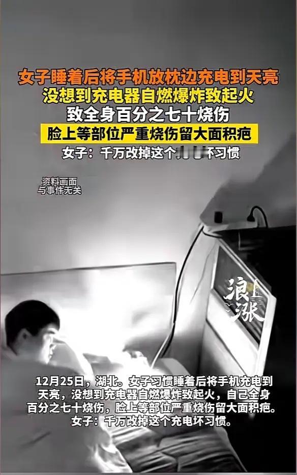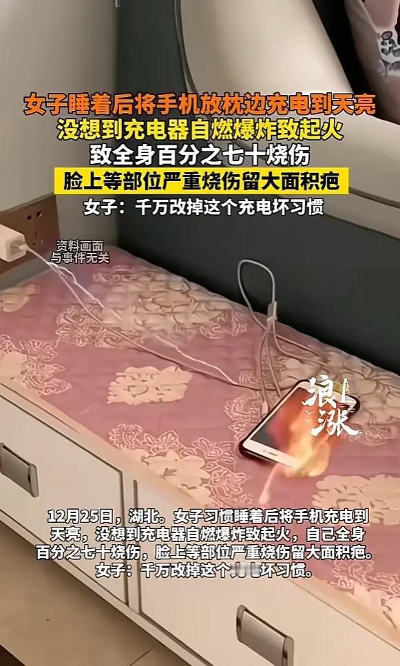 “悲剧还是发生了!”近日,湖北武汉,一女子睡觉时,总喜欢把手机放在枕头旁边充电到天亮,方便自己白天使用,结果在自己熟睡时,充电器突然爆炸起火,导致全身70%烧伤,脸上留下大面积的伤痕。网友:太吓人了吧! 李女士睡前习惯性地把手机插上充电器,放在枕边,想着明天起来又是满格电量。谁能料到,这个她重复了无数次的普通动作,这次竟带来了灾难。凌晨时分,安静的卧室里,充电器突然发生自燃爆炸,火焰瞬间窜出,点燃了床单被褥。 李女士从睡梦中被惊醒,但已来不及躲避,她全身烧伤面积高达70%,其中40%是严重的三度烧伤,面部和双手伤势严重。主治医生介绍,这样的伤势需要进行多次植皮手术,面部和四肢留下的疤痕将伴随终身,未来的康复之路漫长而痛苦。 晚上睡觉让手机充一整晚电,这个做法真的太危险了!锂电池一旦因过充、高温等导致内部短路,温度能在极短时间内飙升到500℃以上,引发爆燃。把手机放在枕头、被子这类柔软织物旁充电尤其危险。 很多人可能不知道,充电器如果一直插在插座上,即便没有连接手机,它也处于持续工作的状态。一般手机充电器的寿命是按每天插电5-7小时计算的,约3-4年。长期不拔会加速电子元件老化,当保护电路失效,这个小装置就可能变成危险热源。 手机充电最好放在坚硬、平整、通风的地方,远离床铺、沙发等易燃物,尽量避免整夜充电,多数手机1-2小时就能充满80%以上,如果充电时发现设备异常发热、有异味或充电速度明显不对,应立即停止使用。 千万别小看这些习惯,有时候一个不经意的动作,背后可能藏着巨大的安全隐患。 各位读者你们怎么看?欢迎在评论区讨论。