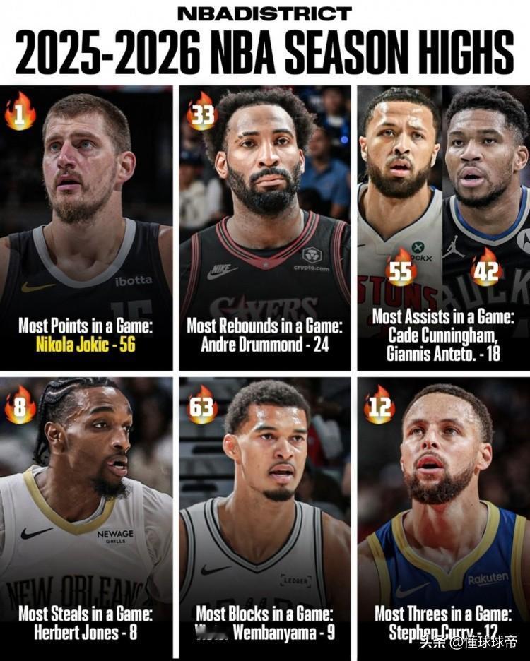 盘点NBA本赛季单场五项数据记录,后面还有机会打破吗? 得分记录——约基奇56分 助攻记录——康宁汉姆和字母哥18个 篮板记录——庄神24个 盖帽记录——文班亚马9个 抢断记录——琼斯8个 三分纪录——库里12个 得分、助攻和三分都有机会打破,每个赛季都会有那60分和20助攻以上的,克尼佩尔有望打破12个三分记录的。 但是篮板、盖帽和抢断是没机会打破了,毕竟24个篮板已经是天花板了,19个盖帽8个抢断也很多年没有出现了,本赛季想要打破很难了。