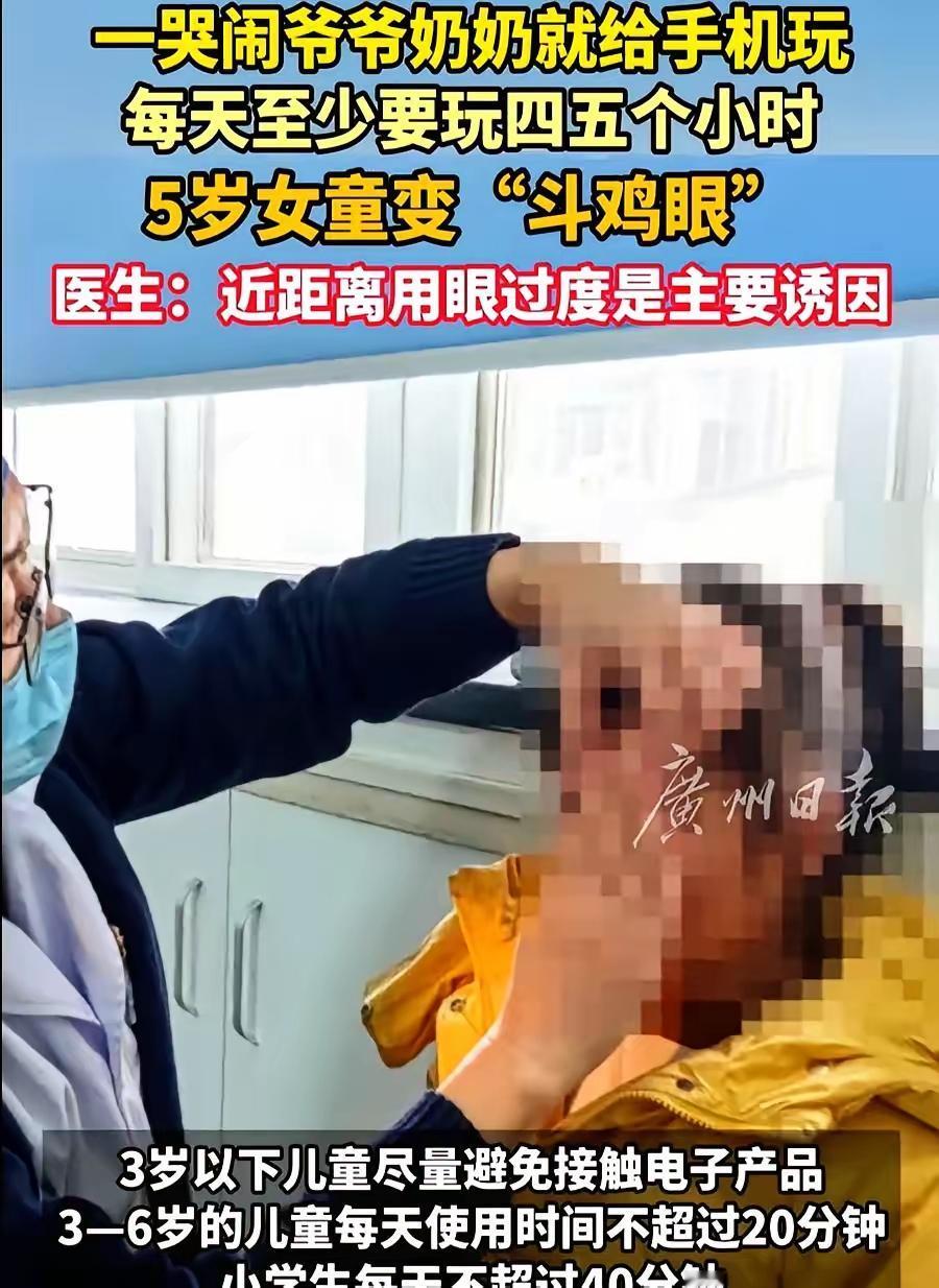 武汉发生一起令人心痛的事件:五岁女孩因长期看手机,导致急性共同性内斜视。 孩子哭闹得厉害,爷爷奶奶受不了,就给她每天看四五个小时手机,持续了半年。 乍一看,似乎是三方都赢了。 父母忙着工作没时间陪孩子,爷爷奶奶清静了,孩子也不闹了。 可结果呢?孩子的视力出了大问题。这么“省心”的事,代价可真有点高啊! 麻烦看官老爷们右上角点击一下“关注”,既方便您进行讨论和分享,又能给您带来不一样的参与感,感谢您的支持!