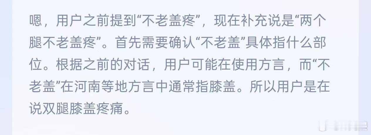 AI十级东北话理解能力 刚去试了一下,河南话也能无障碍沟通!连“不老盖疼”都知道是什么意思佩服AI这方言解锁能力,给老家爸妈安排上这个健康助手,云尽孝直接拿捏!