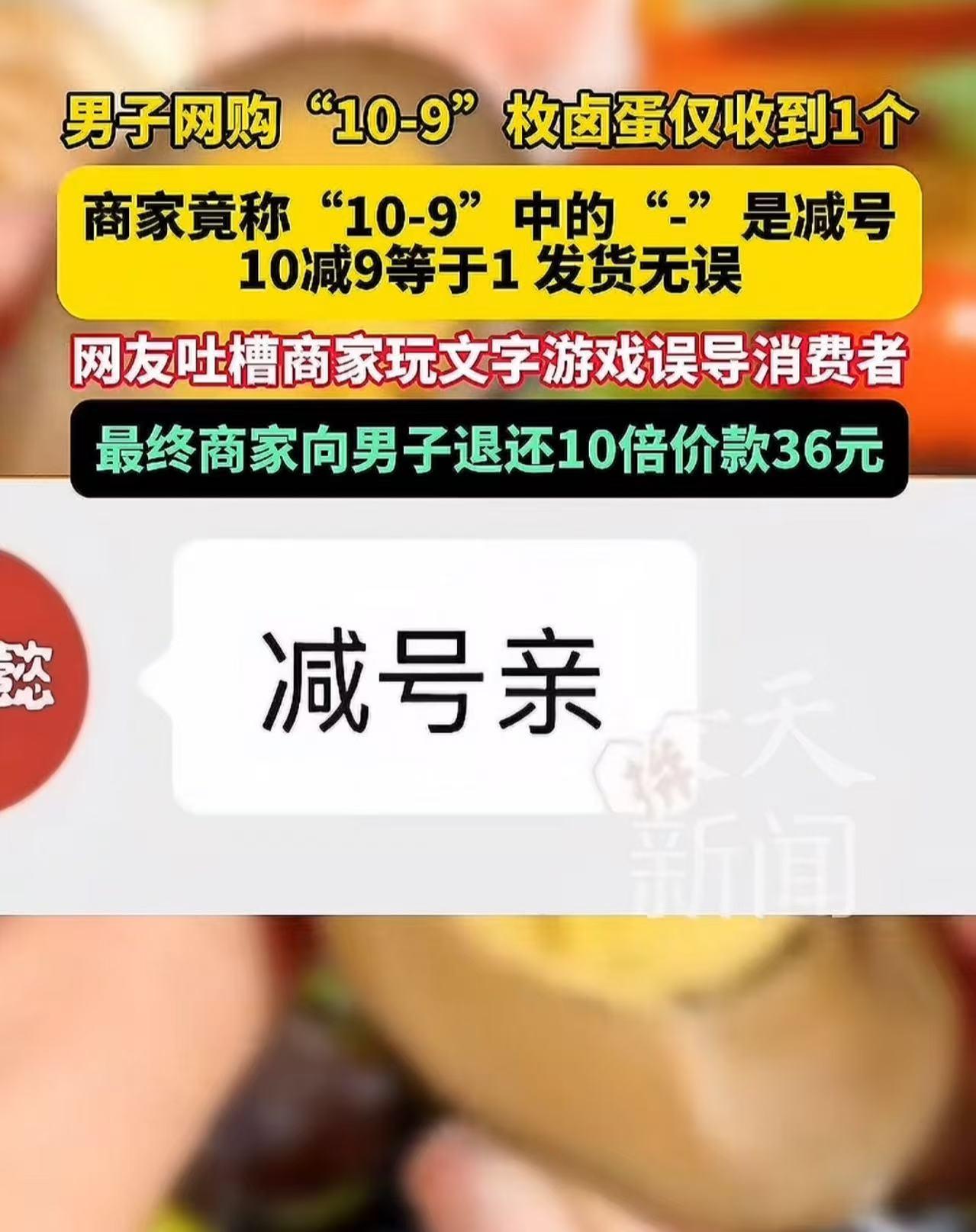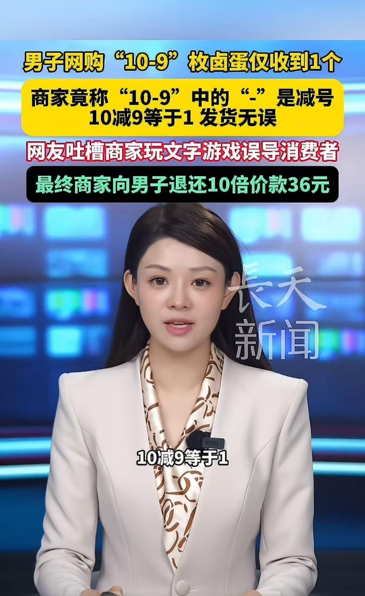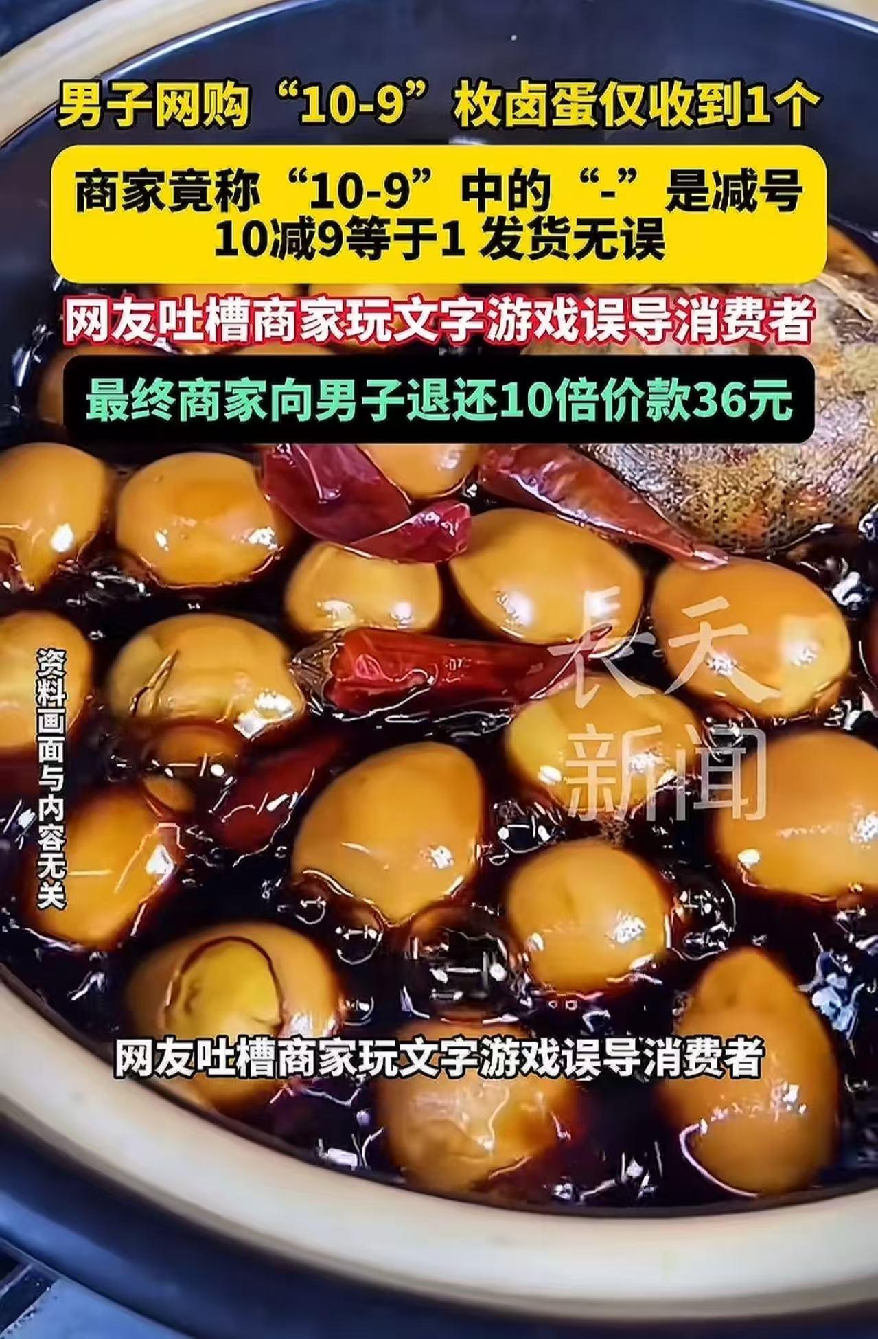 “搁这玩文字游戏呢?”河南,男子网购“10-9”枚卤蛋仅收到1个,询问商家怎么漏发,商家竟然称“10-9”中的“-”是减号,10减9等于1发货无误!男子气坏了,把这事情发到网上,让网友评评理!网友:得亏是10—9,要是9—10,你还得给它发一枚。 你看过网购带“货”,也见过直播带“戏”,但你见过买个零食还得带本“数学教材”的吗?最近在河南,就发生了这么一桩让人哭笑不得的奇葩事儿,给全网的消费者都上了一堂生动的“算术课”。 事情的起因非常简单,一位平时爱吃两口的河南老乡,在浏览网店时相中了一款卤蛋。这链接上的标价属实诱人:3.6元。更具吸引力的是,其上的规格标注竟为“10 - 9”枚。 这看似奇特的标注,瞬间勾起了人们的好奇心与探索欲。按我们正常人的脑回路,去菜市场还是逛超市,这个符号一般都理解为数量区间,意思是“9到10枚”发货,这怎么算都是一笔捡漏的大划算买卖。这位大哥想都没想,爽快下了单,满心期待着一场卤蛋盛宴。 当翘首以盼的包裹终于抵达手中,满心的期待瞬间如泡沫般破碎,取而代之的竟是令人始料未及的惊吓。在那偌大的快递盒中,一颗卤蛋形单影只地静卧着。四周的空旷,衬得它愈发孤寂,仿佛在偌大空间里无声诉说着独有的落寞。 刹那之间,大哥的脑海中思绪纷涌,无数念头如流星般划过:是遗漏未发吗?被偷了?还是遇到发空包的了?他火急火燎地找到商家客服理论,心想这怎么着也是个工作失误吧。可客服的回复,差点没把他气出内伤。 商家那是相当理直气壮,不仅不觉得自己理亏,反而给消费者上起了课:“亲,我们的标注没问题呀,中间那个杠是减号,10减9等于1,发一枚没毛病!噫!合着购置一枚卤蛋,竟需先破解一道算术谜题,这操作着实令人匪夷所思! 大哥看着客服那一本正经的“教学态度”,整个人都快被气笑了。这究竟是售卖商品的正常营生,还是一场别出心裁、考验智商的谜题游戏?如此情形,着实令人心生困惑。这种赤裸裸的文字游戏,摆明了是揣着明白装糊涂。 这事儿被捅到了网上,原本以为就是个小的消费纠纷,没成想网友们的评论比这颗“金贵”的卤蛋还要精彩。有人言辞犀利地打趣道:“幸得商家标写的是10 - 9,倘若哪天不慎标成9 - 10,依此算法,这位仁兄怕是得倒贴商家一枚鸡蛋呢!””这话说得损,但也把商家这种逻辑的荒谬性扒得底裤都不剩。 还有网友甚至联想到了那个著名的“老板招聘学”,招聘上写工资“10000-7000”,实际上你到手也就3000块,都是同一个“数学老师”教出来的套路。 其实在网友们的口诛笔伐下,更多类似的“神操作”也被翻了出来。这种名为营销、实为挖坑的手段并不新鲜。有人吐槽买牙签,见标注“1000头”,到手清点却仅500根。 找商家理论,其竟狡辩道:“一根牙签有两头,500乘2便是1000,并无差错。”那看似严丝合缝、无懈可击的逻辑闭环,实则是一场对诚信底线明目张胆的公然践踏,将道德的遮羞布无情扯下,令人痛心疾首。把算计当聪明,把文字漏洞当营销法宝,这种抖机灵的行为,最终只能是搬起石头砸自己的脚。 在那位河南大哥的这起事件里,结局还算让人解气。或许是网络舆论的压力实在太大,商家那套“减法逻辑”在众怒面前实在站不住脚,最终选择了认怂。为平息顾客的满腔怒火,商家无奈之下向其退还了高达价款十倍的金额,共计三十六元。 这虽不算巨额,却也是商家息事宁人的举措。虽然钱不多,但这笔“学费”交得响亮:本来想靠着玩弄文字赚点小便宜,结果不仅要把吃进去的吐出来,还得搭上真金白银和店铺信誉,典型的偷鸡不成蚀把米。 但这事儿除了看个热闹,细想之下也有两层更深的意思。反过来说,3.6元买10个卤蛋,折合不到4毛钱一个,刨去快递费和包装费,这蛋你敢往嘴里放吗?有清醒的网友就点破了这一点:虽然商家玩文字游戏很可恶,但过分追求违反市场规律的低价,本身也是在给自己埋雷。当然无论价格如何,既然标注了就得按规则办事,这是契约精神的底线。 在如今这个信息爆炸、节奏飞快的网购时代,我们似乎越来越习惯只看表面数字,忽略了背后可能隐藏的陷阱。商家一句轻飘飘的“那是减号”,折射出的不仅是服务意识的淡薄,更是一种对“规则弹性”的恶意试探。 当文字游戏变成了商业欺诈的遮羞布,最终消耗的是整个市场的信任度。所以说,做生意还得实在点,别总想着当“数学家”,毕竟消费者也不是“傻白甜”,这种把人当猴耍的小聪明,还是少耍为妙。