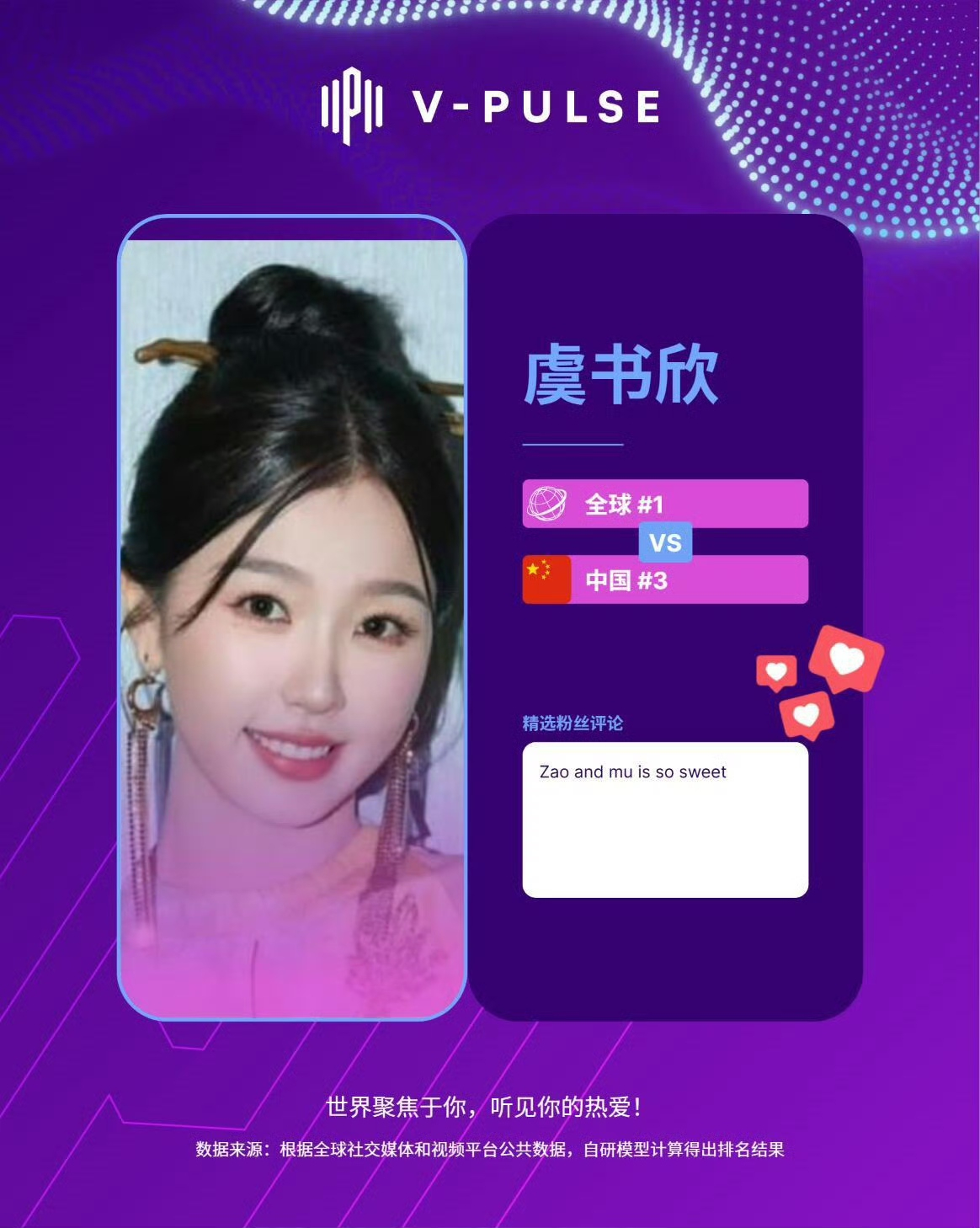 虞书欣V-PULSE华语艺人国际排行榜top1,个人海外平台涨粉目前超50w,基