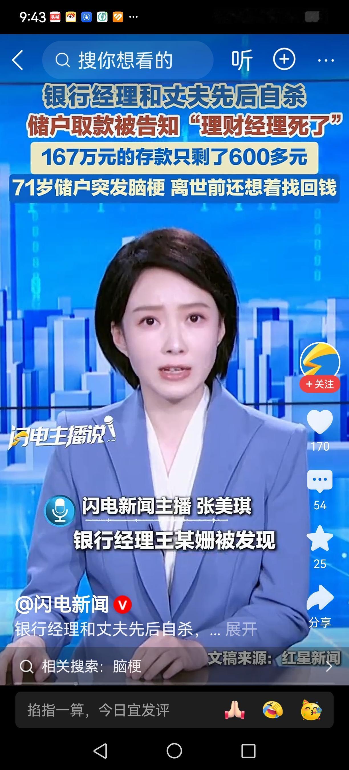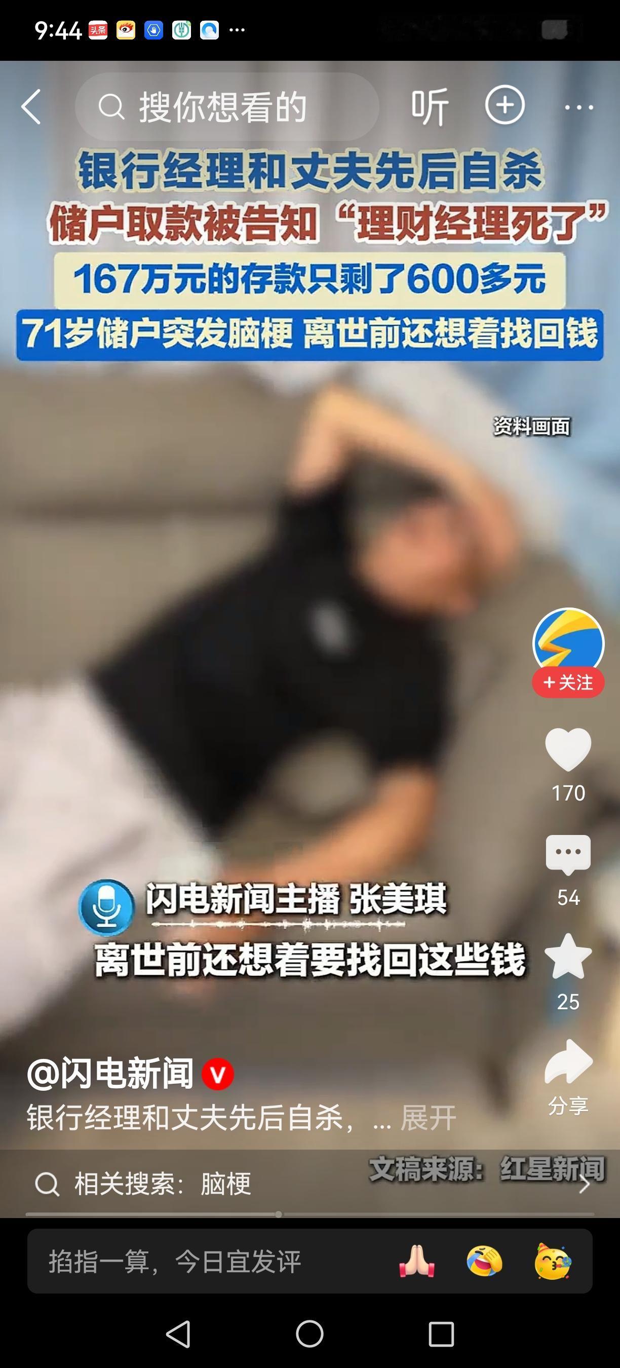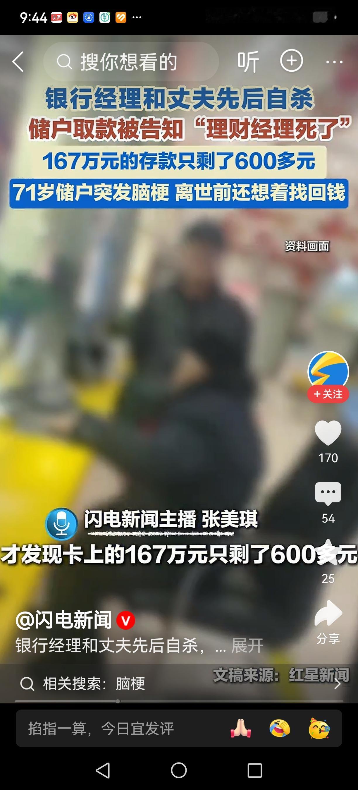 71岁老汉167万存款只剩下600元,当老汉听到这个消息时直接突发脑梗,临死前还跟老伴交待要找回这些钱,可是给他办理银行业务的经理却自杀了身亡了,还到哪里去把钱找回来,老人家一生省吃俭用,存款为了以后的养老,可惜了钱没了人也没了。