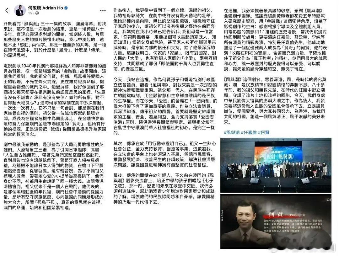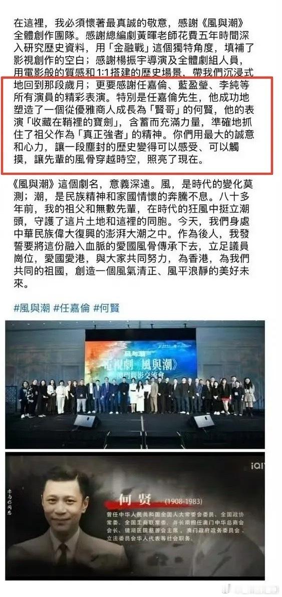 但凡看《风与潮》的都会觉得任嘉伦就是何贤,连原型后人高度评价任嘉伦,“特别是任嘉伦先生,他成功地塑造了一个从优雅商人成长为‘贤哥’的何贤,他的表演‘收藏在鞘里的宝剑’,含蓄而充满力量,准确地抓住了祖父作为‘真正强者’的精神。”