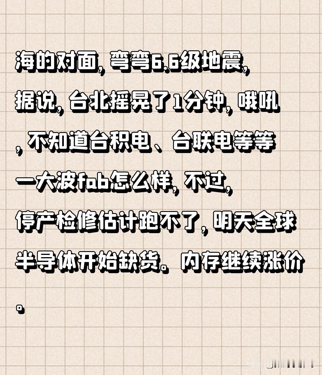 海的对面,弯弯6.6级地震, 据说,台北摇晃了1分钟, 哦吼, 不知道台积电、台联电等等一大波fab怎么样, 不过,停产检修估计跑不了, 明天全球半导体开始缺货。 内存继续涨价。 没涨的也可以趁机涨一波。 地震 台湾海域地震 台地震 宝岛地震