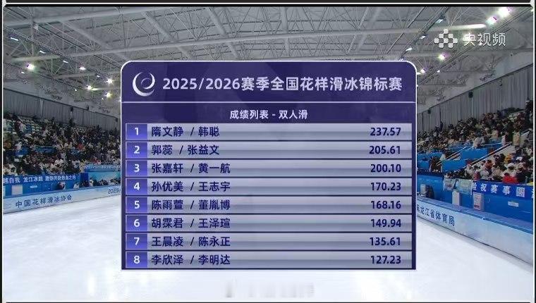 2025/2026赛季全国花样滑冰锦标赛隋文静/韩聪总成绩237.57分夺冠,加上中国杯202.97分,选拔赛两场总分440.49分排名米兰冬奥会中国队选拔赛第一,获得米兰奥运会名额,继平昌和北京后连续三届出战冬奥会! 隋文静韩聪全锦赛夺冠
