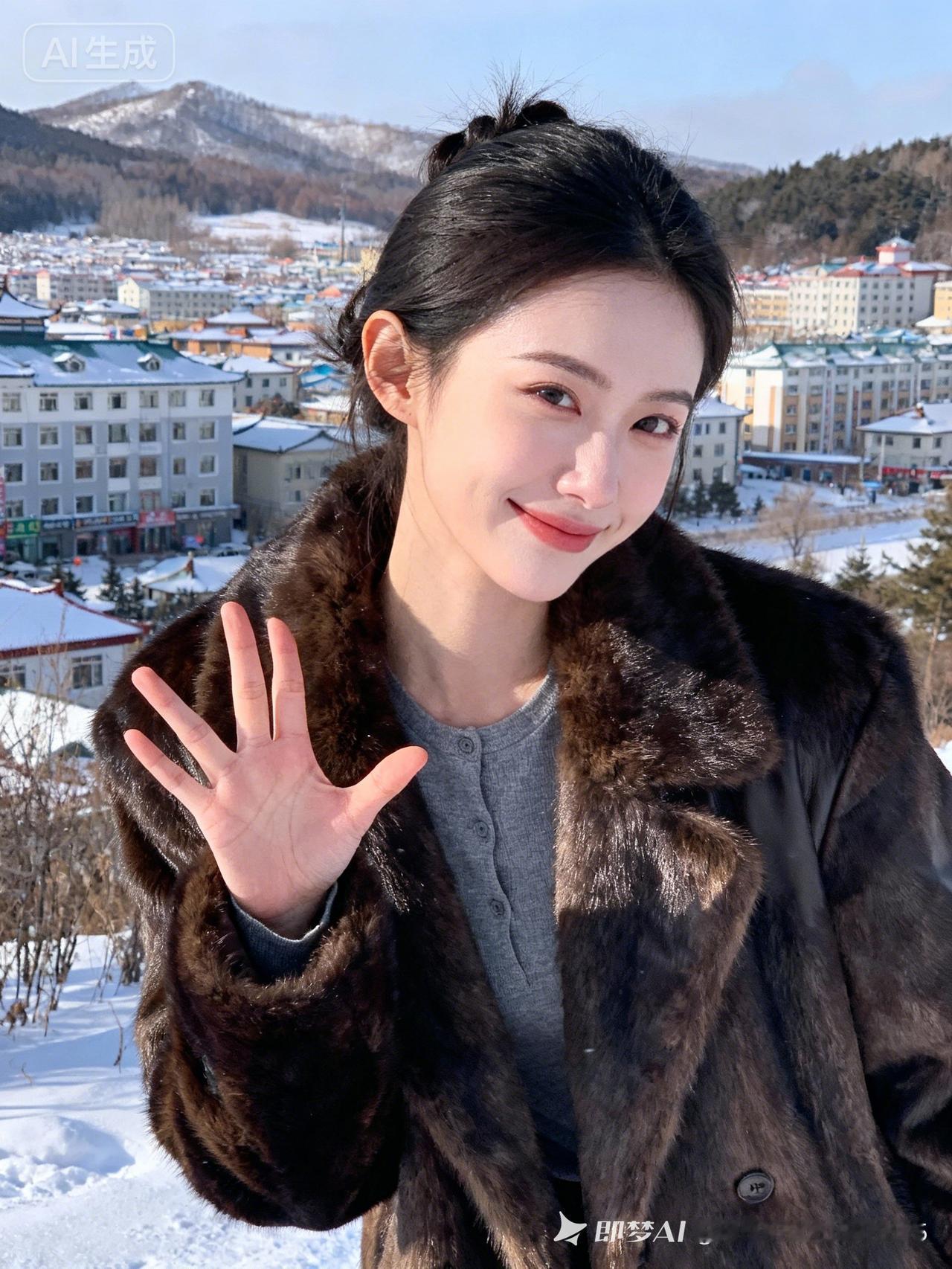 在延吉市的雪景前,一位冷白皮、瓜子脸的女子穿着高质量皮毛一体大衣,森系发型温婉,身体微倾,自然光影与雪景映衬,呈现真实生活快照的美感。