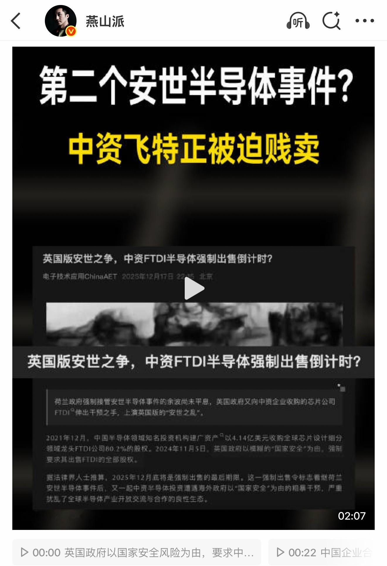 荷兰以“经济安全”为由冻结安世半导体全球运营的风波未平,英国又对中资出手!全球USB桥接芯片领军企业飞特(FTDI),聚焦民用商用无敏感技术,2021年建广资产以4.14亿美元合规收购其80.2%股权,稳定运营三年无违规。2024年11月,英方凭模糊“国家安全”理由强令出售股权,2025年12月底为最后期限,中资方司法救济遭驳回,英方始终拿不出实质证据。两起事件如出一辙,本质是西方竞争不过便动用非法手段打压,中资半导体海外并购遭遇系统性围堵,绝非个例,亟需高度重视!