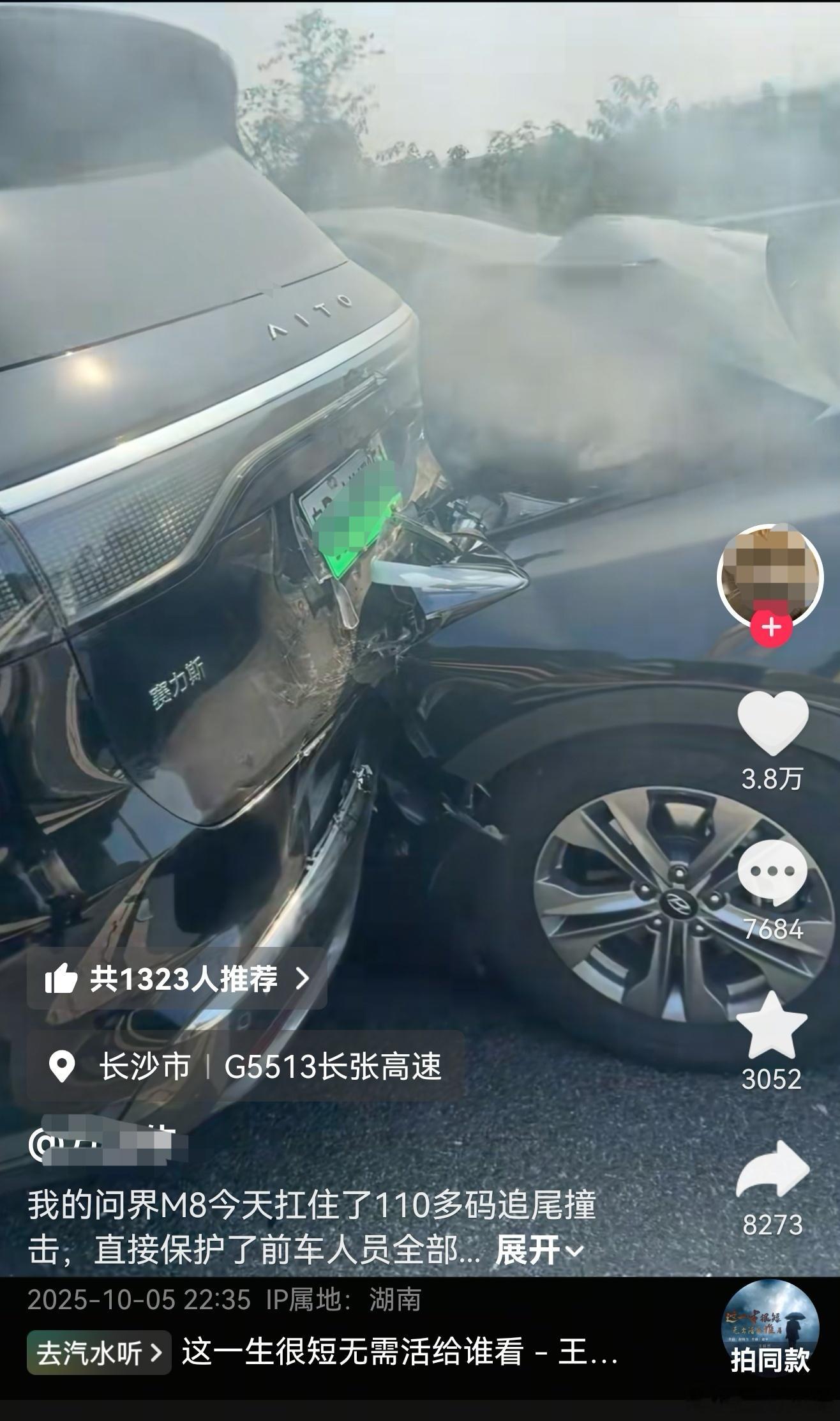 问界M8高速被追尾,后车起火。。。刷到一个视频,M8被高速追尾只是衣角微脏,而撞