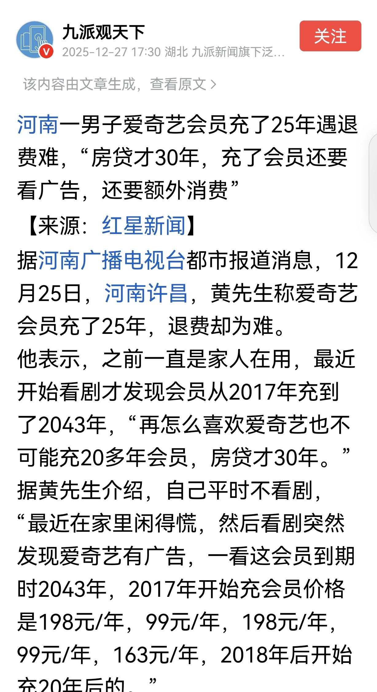 “有钱人真会玩!”河南许昌,一男子惊讶的发现,家人把某奇艺会员从2017年充值到2043年,长达25年,充了会员还要看广告,想不看还要再花钱,好家伙,房贷最高也才30年,谁知道25年后会咋样?男子当即决定退款,可让他无法接受的一幕出现了。 12月25日这天,黄先生闲来无事,准备找个电视剧或者电影消磨时间。 黄先生知道家里人买了某奇艺会员,看剧很方便,也不会在看的正来劲时插播广告,他就直接登录了某奇艺APP。 这一登录不要紧,让黄先生目瞪口呆,他竟惊讶的发现,家人从2017年开通某奇艺会员,竟然充值到了2043年,他掐指一算,好家伙长达25年。 而2043年,黄先生已经50多岁了,世事变迁,谁知道那时候是啥情况?可能电视都被新科技取代了,有没有电视都不一定,这会员充的太离谱了吧? 说实话,房贷最高也不过才30年,这会员快跟房贷比肩了。 说起某奇艺,以前都是家人在用,黄先生没有时间在上面浪费,每天都在为生活忙碌,要不是他偶尔有点时间,准备看个剧,还发现不了这档子事。 在他看来,充值个三五年还可以,一下子充值25年,这也太不可思议了。 黄先生问家人,家人告诉他,原来2017-2018年,某奇艺搞活动,优惠力度大,家人就动心了,脑袋一热充值25年。 但黄先生认为,再便宜也不应该这么做呀,因为如今日新月异,20年后,谁知道世界变成啥样? 黄先生立马决定退费,于是他联系上了某奇艺客服,对方爽快的答应了,告诉他没消费的部分是可以退的,黄先生如释重负,可客服接下来的话,让黄先生傻眼了。 客服告诉黄先生,会员费得原路返回,可黄先生家人之前充值的某宝账号已经弃用了,而且被别人注册使用了。 也就是说,会员费原路返回,就跑到别人账号上了,他一分钱捞不到,退费还不如不退费。 对此,黄先生很是郁闷,他坚决不接受,既想退费,又想把钱收入囊中,但客服告诉他,没有其他解决方案,让黄先生等着专人来跟他对接核实处理。 但黄先生认为,这是某奇艺敷衍拖延自己的借口而已。“房贷才30年,会员充了25年”真的又好笑又无奈!花了钱不仅要看广告、额外消费,想退未消费的部分还被账号问题卡脖子,换谁都得急。平台优惠诱导充多年会员容易,退费却设置重重门槛,真心希望能多站用户角度考虑,别让“长期会员”变成“长期麻烦”,早日给个合理解决方案。 有人觉得某奇艺做的对,人家给你返钱,是你的账户不对啊,不能说人家赖皮推诿,比一般的要好多了!小孩玩的游戏充费就很难追回! 一是看有优惠自己交的钱订的、不是某奇艺强迫你订的,二是人家原路退回给你,而你某宝账号变了也是你的问题,现在是你要退订却全怪到某奇艺身上!这种人也是醉了! 黄先生家这“25年会员”,简直比房贷还夸张!房贷顶多30年,这会员直接给你安排到2043年,那会儿黄先生都50多岁了,电视啥样都不知道,这钱花得跟“买未来”似的,谁能保证平台能活到那时候? 家人当初肯定是被“优惠”冲昏了头,觉得捡了大便宜,结果现在想退钱,才发现掉进了“原路退回”的大坑里——账号都换了,钱退回去等于白送别人,这搁谁身上能不急眼? 最让人憋屈的是,平台这操作太“鸡贼”了!说退钱的时候痛快得很,真到退的时候,规则全卡着消费者。 账号变更这种事儿太常见了,谁还没个换手机号、弃用旧支付方式的时候?平台就不能灵活点?比如退到实名认证的银行卡,或者让用户提供新账号?非得死磕“原路退回”,这不是故意给用户添堵吗? 说白了,平台就是想用“长期会员”绑住用户,钱到手了,退费就各种推脱,这吃相太难看了! 还有啊,充了会员还得看广告,想不看还得再花钱,这不是“割韭菜”吗?会员的意义不就是图个清净? 结果,平台变着法儿加广告、推付费服务,这不是把用户当冤大头吗? 黄先生这遭遇,其实就是平台“重营销、轻服务”的典型例子,优惠时哄着你充钱,退费时冷着脸甩锅,用户体验全靠“运气”。 真心希望平台能长点心!别光想着怎么套路用户,多想想怎么提升服务!用户花钱是买享受,不是买麻烦! 像黄先生这种情况,平台就该主动担责,给个灵活的退款方案,别让“长期会员”变成“长期闹心”!毕竟,口碑坏了,再大的优惠也留不住人心啊! 《最高人民法院关于审理预付式消费民事纠纷案件适用法律若干问题的解释》第6条规定:经营者不得以格式条款等方式设置不合理的退费障碍。 预付费用后,消费者未消费的部分有权要求退还;退款方式应遵循公平、便民原则,不得以“原路退回”等单一形式限制消费者合法权益。 黄先生没使用的20余年会员费属于“未消费部分”,平台必须退还。 “原路退回”属不合理障碍:平台强制要求退至已停用且被他人占用的支付宝账号,实质剥夺了黄先生的退款权,违反“便民原则”。 关注@灋律盐究员 学法辩是非,用法止纷争。