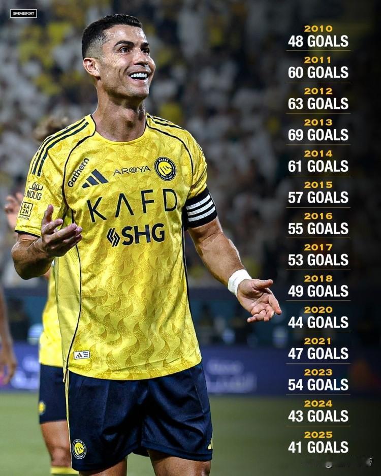 天神下凡了,C罗上演梅开二度14个自然年进球40+! 在昨晚进行的一场沙特联赛中,C罗天神下凡在上半场就上演梅开二度,带领利雅得胜利在主场3:0完胜阿科多豪取开局10连胜,40岁的C罗再次让全世界顶礼膜拜。 先胖不算胖,后胖压倒炕,梅西在美职联进球如麻,现在美职联结束了,轮到C罗开始表现了,C罗在2025年已经打进41球了,这是C罗职业生涯第14个自然年年度进球超40球,超越梅西足坛历史第一人。 同时出来也带领利雅得胜利创造了沙特联赛记录,成为沙特职业联赛历史上第一支单赛季开局10连胜的球队,看来沙特冠军C罗拿定了,梅西拿了美职联冠军,C罗也顺理成章的要拿沙特冠军了。