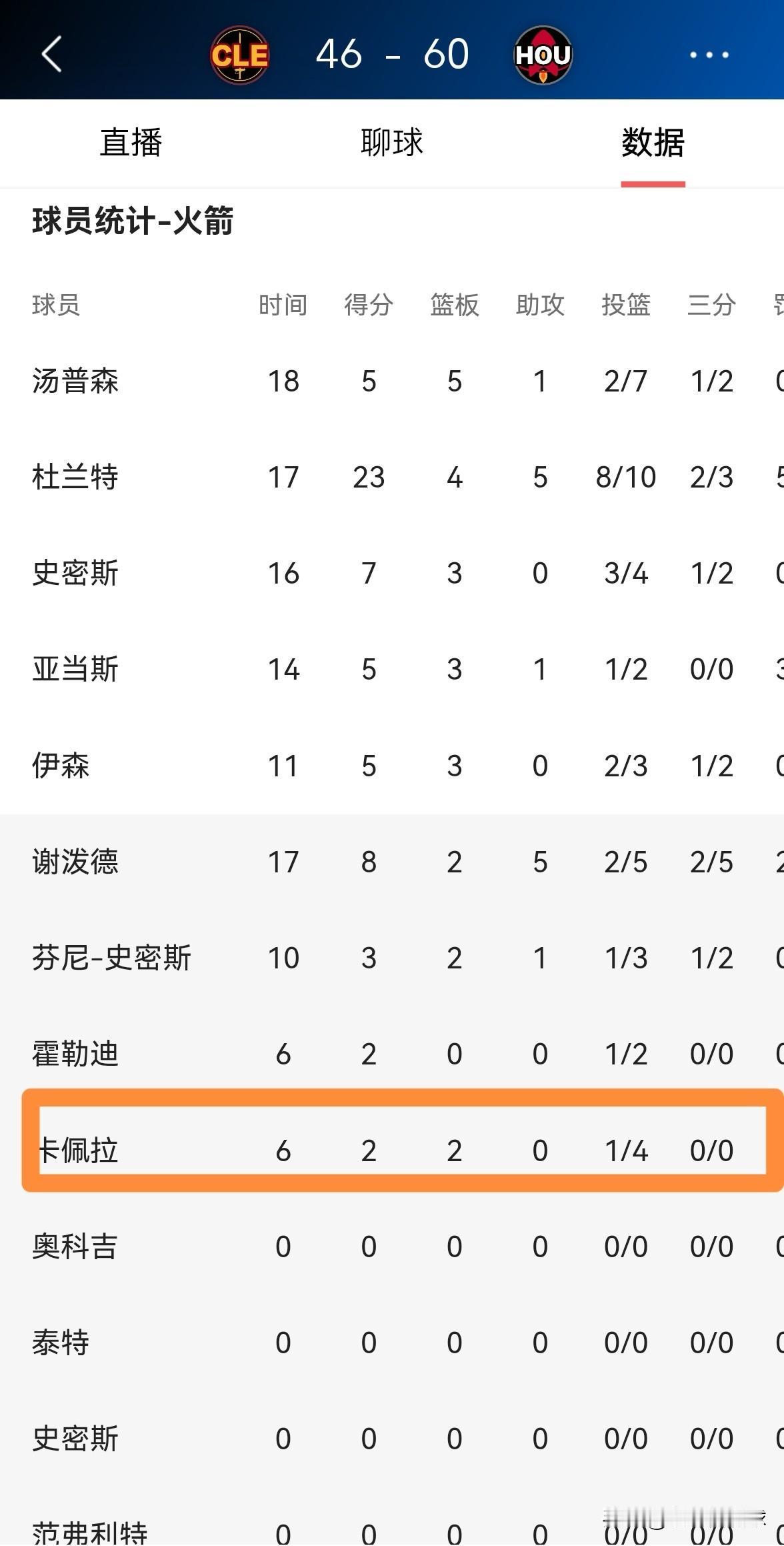 火箭中锋卡佩拉真是太把自己当回事了!在今天火箭主场迎战骑士的上半场比赛中,卡佩拉替补出战6分钟,投篮4中1非常低效的得到2分,不过有2篮板1抢断,他的场上正负值为+1。 作为一名替补中锋,卡佩拉在短短的6分钟的上场时间里就出手了4次,我觉得卡佩拉真是太把自己当回事了,毕竟卡佩拉出手太多肯定会影响球队的进攻。