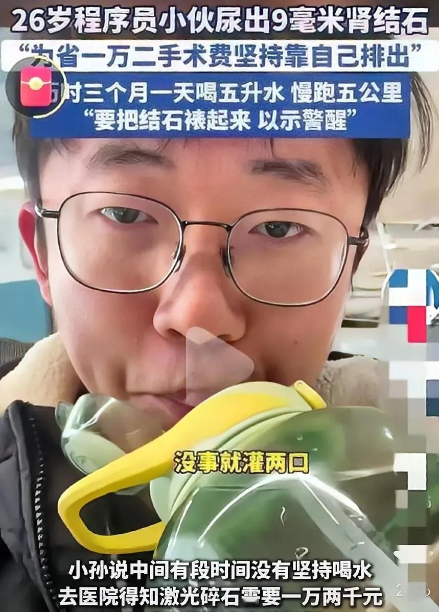 见过狠人,没见过这么狠的人, 山东一26岁小伙为了省一万多的手术费,听了医生的建议,每天坚持喝5升水以上,并慢跑5公里,历时三个月,硬生生把直径9毫米的肾结石尿了出来。 说实话这种情况真的很少见,通常是6毫米以下的结石才能够保守排出,而小伙排出的这颗9毫米的结石大小都跟小石子一样了,也是结石案例中自主排石的先例了。 据小伙口述他是因为常年不爱喝水加上晚上睡前还喜欢喝牛奶,导致患上了肾结石,去医院检查后得知手术费要1万2于是便选择自主排出。他每天坚持喝柠檬泡水,至少5升打底,运动量也不低于每天跑步五公里。 这可不是一个轻松的活,大家都知道大可乐大雪碧的瓶子才2升,小伙每天摄入5升水相当于两瓶半,厕所都不知道要跑多少趟,更何况每天要上下班还得坚持跑五公里,这种毅力和恒心太强了。 为省一万多手术费,小伙每天喝5升水跑5公里,硬生生排出9毫米结石!这坚持绝了,普通人真扛不住,太佩服了!