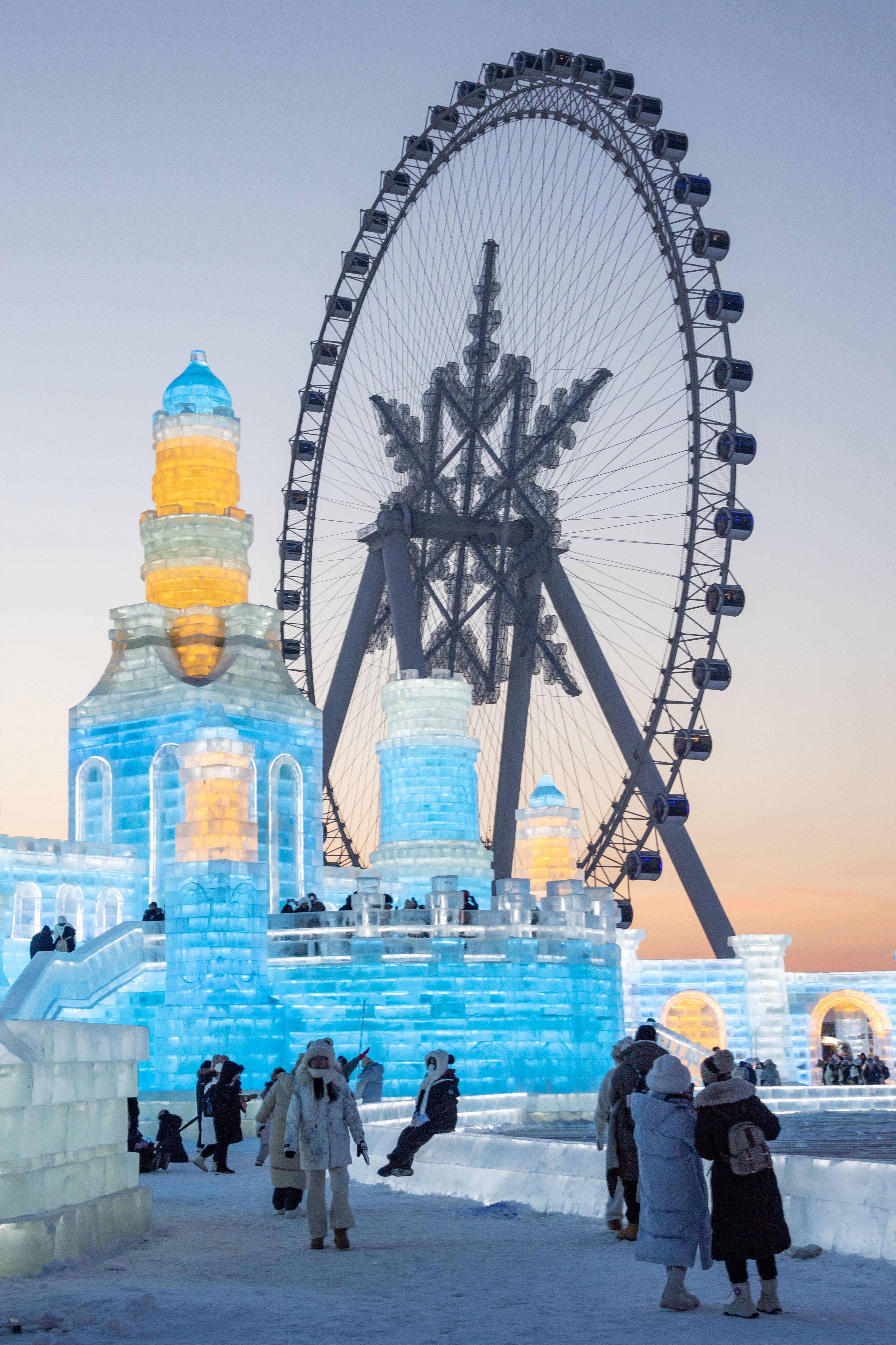 2️⃣.雪花摩天轮,俯瞰园区全景+松花江,傍晚时段拍照最出片。