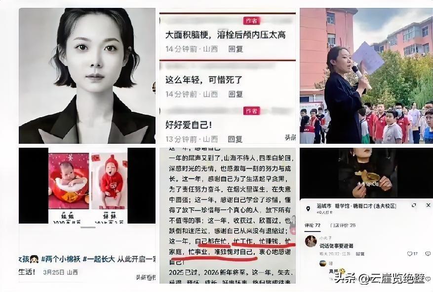 谁能想到呢?山西运城icon32岁女教师悦悦,12月24日突发大面积脑梗去世。据说她于12月22日冬至发布的最后一条视频, 呼吁大家早回家早睡,过好这个节气。 她说:“冬至这天要吃饺子,吃了饺子才有精神。还有汤圆,象征团团圆圆。冬至这天还要好好睡一觉,睡好了才能有精神工作。” 她继续说:“冬至不听劝,来年新坟起。” 悦悦有两个女儿,一个5岁,一个半岁。 她是一名人民教师,工作繁忙,还兼职班主任和教研组长,负责科目教学和学生管理,工作压力可想而知。 她的突然离世,让人痛心疾首!也是给我们敲响了警钟! 都说“慢下来,心静下来,想清楚,让生活回归本质。”可是,现实呢? 人们普遍都喜欢“快”,快餐、快递、快捷酒店……甚至有人喜欢“火速”“火爆”“热门”,这仿佛是一种攀比,一种优越,一种快速发展的标志! 可是,有没有人想到,这样的“快”带来的后果,是让人猝不及防的,是让人痛心疾首的,是让人后悔莫及的! 生活可以“慢”一些,让我们看清脚下的路;工作可以“慢”一些,让我们从容不迫,不留遗憾;节奏可以“慢”一些, 让我们关注一下自己的身心健康,让我们陪伴亲人在身边多一些…… 生活不易,且行且珍惜! 大家说对吗?