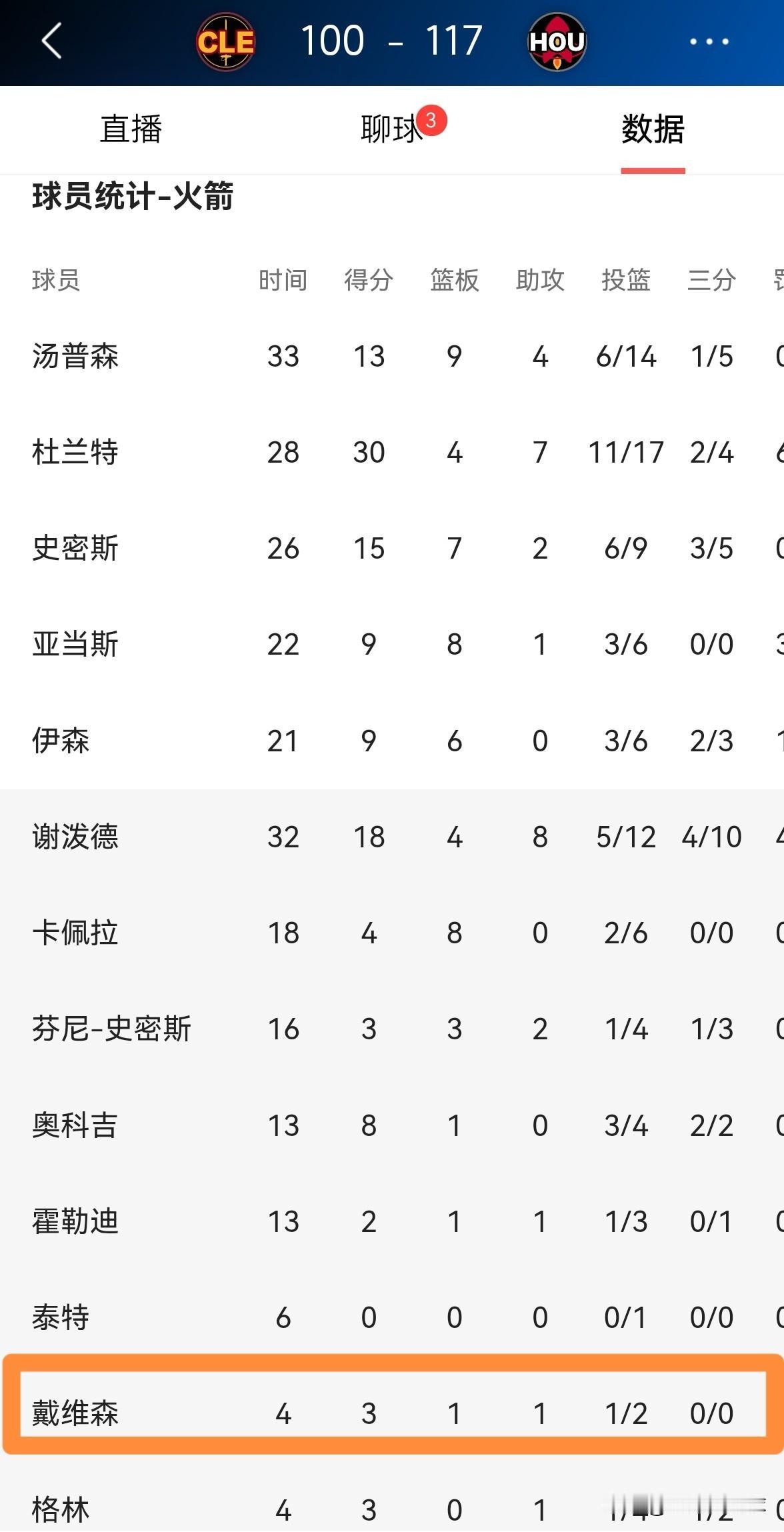 我强烈呼吁火箭主帅乌度卡重用小将戴维森!在今天火箭主场以117:100大胜骑士的比赛中,戴维森替补出战4分钟,投篮2中1,其中罚球2中1得到3分1篮板1助攻。 如果火箭想要在季后赛中走的更远,那么球队必须挖掘替补阵容的潜力,而戴维森就是一名非常具有潜力的年轻人。如果乌度卡教练能够让戴维森进入到球队的轮换阵容里,那么我相信戴维森一定会成为一把利器。
