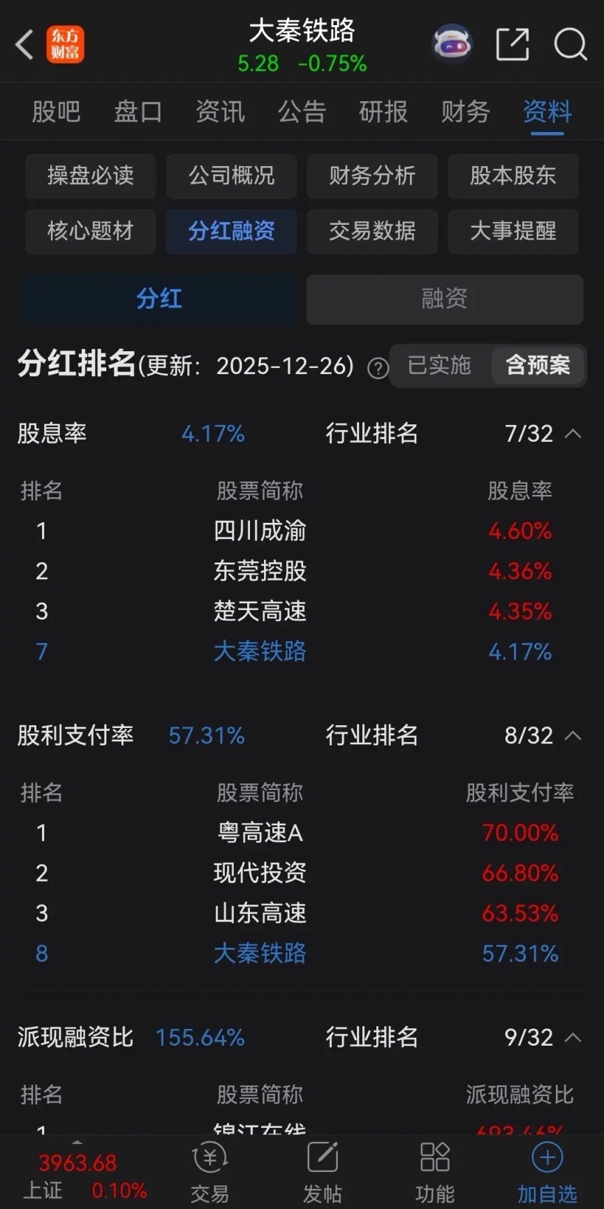 大秦铁路这走势,对于价值投资的股民来说,简直就是一场噩梦!从7月份以来,股价一路单边下跌不回头,从6.74元跌到了5.26元,5个月跌幅高达22%。不仅跌破了四月份关税贸易战时的最低点,也跌破了去年9月份大盘2600多点时的最低点,更是创出了近三年的新低。可以说近三年奔着股息进来的股民全部被套牢。而公司现在分红越来越少,股息率只有4.17%,行业排名第七,这5个月下跌了22%,得多少年的股息才能填补上?最恶心的是它的走势,“温水煮青蛙”式的阴跌,让股民们总感觉到底了,抄底的股民一波接着一波被套。其实地板下面有地下室,地下室下面有地窖,地窖下面有地狱,地狱下面还有18层呢。