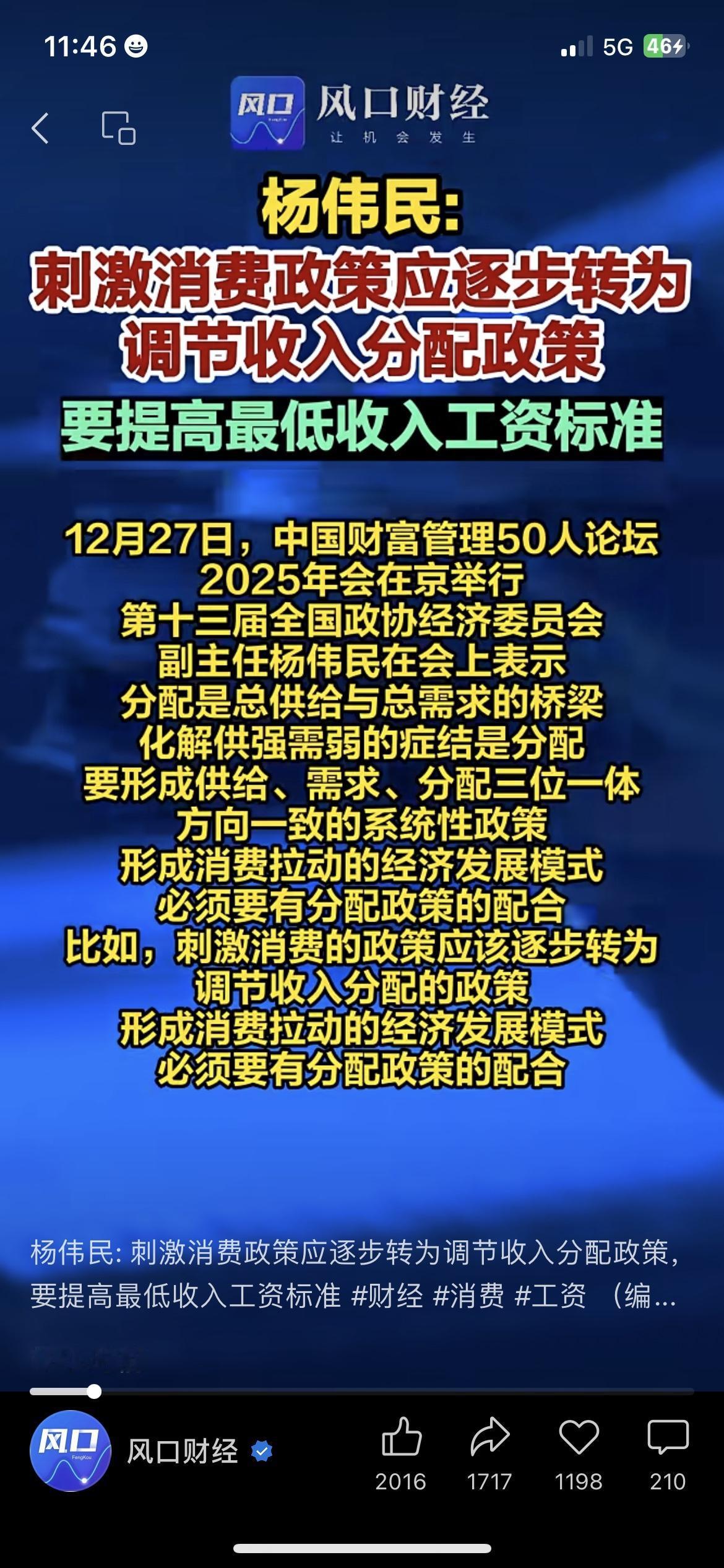 收入分配政策要调整,最低工资标准或迎上调财经 深圳电子厂的阿强,每月靠最低工资勉强糊口,刷到这个消息,心里瞬间暖了一截。 杨伟民提出核心方向,把消费刺激转到收入分配调节上,重点就是给打工人涨最低工资。 还会靠税收和社保转移支付,专门给低收入群体添收入支持,实打实帮大家增收。 老百姓手里能攥住更多钱,日子才能过得更踏实。 你觉得最低工资上调能真正改善打工人生活吗? 你所在城市的最低工资标准多久没变动了?调整工资标准 工资收入标准