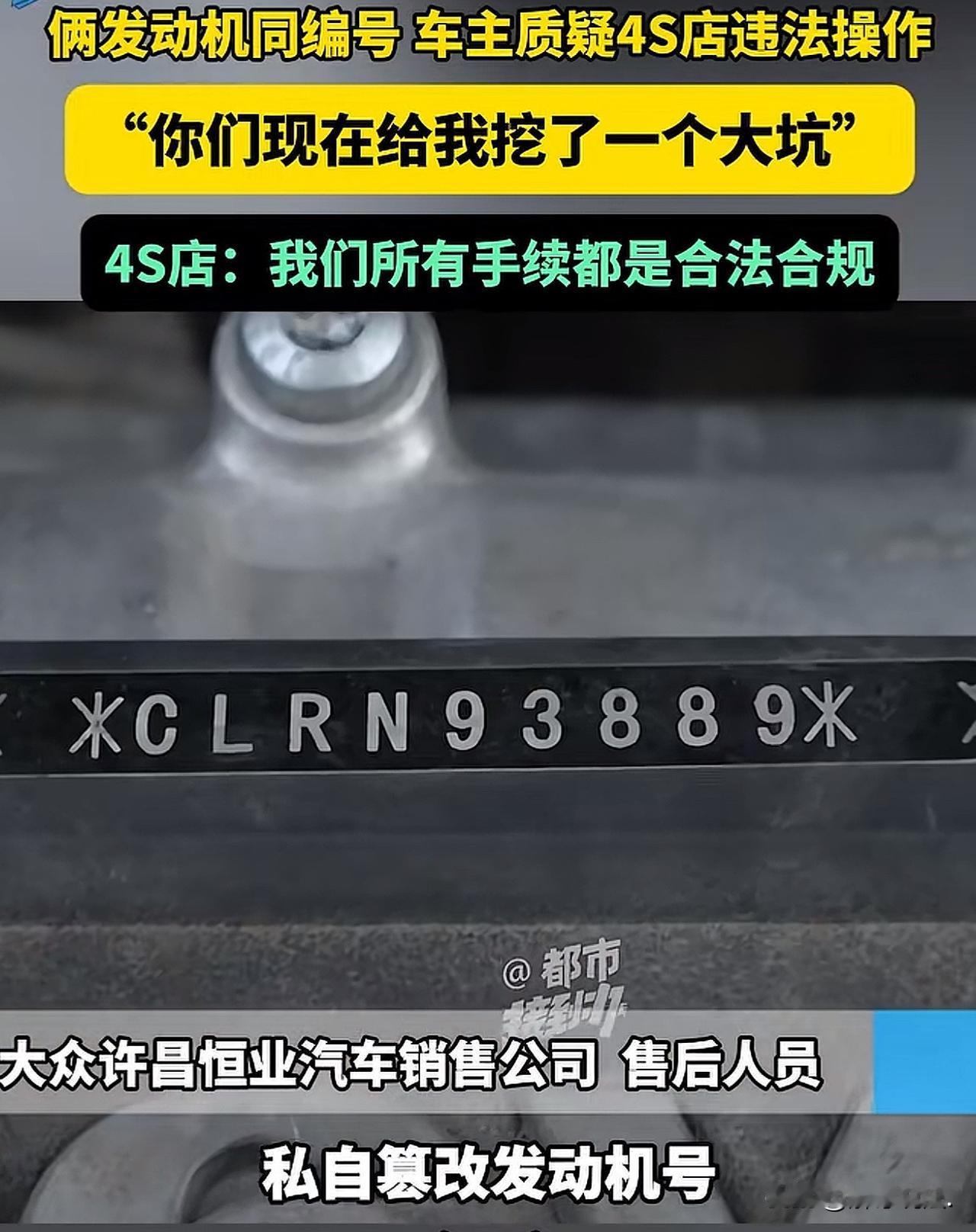 河南许昌,男子在大众4S店换发动机,结果发现,新换的发动机上面的编号和旧发动机编号一模一样,男子认为自己被坑了,找4S店讨要说法。4S店解释说,这是“在制发动机”,编号沿用旧的,没问题的。男子不干了,要求4S店以5.5万元的价格回收这辆车,4S店认为男子想讹人,果断拒绝了。随后,双方闹到车管所,车管所工作人员告知:新旧发动机用同一编号没问题,但要过来备案。男子又咬着“4S店当初告知已备案”说事,坚决要求赔偿。4S店只承认程序出错,让男子走法律程序。 今年9月份,郭先生的大众车出了故障,送到当地一家大众4S店维修,工作人员检查后说需要更换发动机。 郭先生没多想,当场同意了。 等车子修好提车时,他无意间发现了一个离谱的问题:新换的发动机上,竟然打着和旧发动机完全一样的编号,93889。 郭先生当时就懵了,发动机编号就跟人的身份证号一样,是独一无二的,咋能新旧共用一个号? 他当即找4S店讨说法,质疑这种操作是严重违法行为。 可4S店的工作人员却轻描淡写地解释,说更换的是“在制发动机”,编号沿用旧的不影响使用,后续的变更手续也能正常办。 郭先生半信半疑,暂时把车开回了家。 谁知道,这事儿还没完。 上周末,郭先生越想越不对劲,找来媒体曝光了此事。 为了弄清楚4S店的操作到底合不合规,记者跟着郭先生和4S店的工作人员,一起去了许昌市车管所咨询。 车管所的工作人员明确表示,车辆更换发动机后,新发动机沿用旧编号,只要能确保发动机的唯一性,这种操作是可行的,但关键前提是必须到车管所进行备案。 可郭先生的车早在9月份就换好了发动机,直到现在,4S店压根就没去办过备案手续! 记者又和郭先生来到4S店,负责人称工作流程有疏忽,程序上出了错误,还说现在可以帮郭先生去补备案。 这话一出口,郭先生当场就怒了。他质问对方:“就算是程序错误,你当初为啥要骗我说已经备案好了? 哪怕你当时告诉我备案通道停了,需要等一等,我也能理解,可你为啥要睁眼说瞎话?” 面对郭先生的质问,4S店的负责人哑口无言,只丢下一句“我无法回答你”。 更让郭先生气愤的是,双方沟通的过程中,4S店还倒打一耙,吐槽郭先生提“无理要求”。 对方说,郭先生之前让他们以5.5万元的价格收购这辆车,可这车的市场价值也就1万元左右,这个要求他们实在没法满足。 听到这话,郭先生立刻反驳,说自己根本没提过索赔,只是想彻底解决问题。 他还说,当初车子出过一次水淹事故,水都淹到仪表台了,当时完全可以走全损理赔,可他因为爱惜这辆车,没舍得那么做。 后来4S店主动提出按当年的保险价回收,报出了3.4万元的价格,他觉得太低才没同意, 这怎么就成了“无理要求”? 现场,郭先生还提出要查看发动机的合格证和旧发动机的缸体,4S店的人拿出了合格证,却迟迟不肯提供旧缸体。 记者注意到,4S店展示的旧缸体上有明显的破损,上面的编号也正是93889,和郭先生车上新发动机的编号一模一样。 车管所的工作人员还特意提醒郭先生,发动机更换后未备案,相关手续存在漏洞,一旦提交审核,郭先生作为车主可能会面临罚款、扣车甚至拘留的风险。 但工作人员也强调,这是针对手续造假的情况,如果4S店能提供合规的全套手续,问题就能妥善解决。 可郭先生对此根本不买账,他拿着那份所谓的合规手续,满脸质疑:“你们之前连备案这么大的事都能骗我,现在说手续全合规,我怎么信?” 4S店的工作人员却始终坚称,他们是在合规合法的前提下进行的维修,所有手续一应俱全,还表示如果郭先生要审车,他们可以全程配合。 一边是车主的满心疑虑和愤怒,一边是4S店的反复辩解和“合规”说辞,这场发动机更换引发的纠纷,至今还没有一个明确的结果。 郭先生说,他会继续维权到底,一定要讨个公道。 《机动车登记规定》第16条规定:已注册登记机动车更换发动机,机动车所有人应向登记地车管所申请变更登记,且需在变更后十日内办理;未按期办理的,可处警告或200元以下罚款。 4S店在9月份给郭先生换的发动机,却未按规定备案,还谎称已备案,违反法定变更登记义务。 导致郭先生有可能面临罚款、扣车等风险。 4S店必须承担补备案费用,并赔偿由此产生的合理损失(如误工、交通成本)。 《消费者权益保护法》第55条第1款规定:经营者提供商品或服务有欺诈行为的,应按消费者要求增加赔偿,金额为服务费用的三倍;不足五百元的按五百元计。 4S店明知未备案却故意告知已备案,有“故意告知虚假情况、隐瞒真实情况”的嫌疑。 郭先生可凭沟通记录、录音等证据,主张相应赔偿。