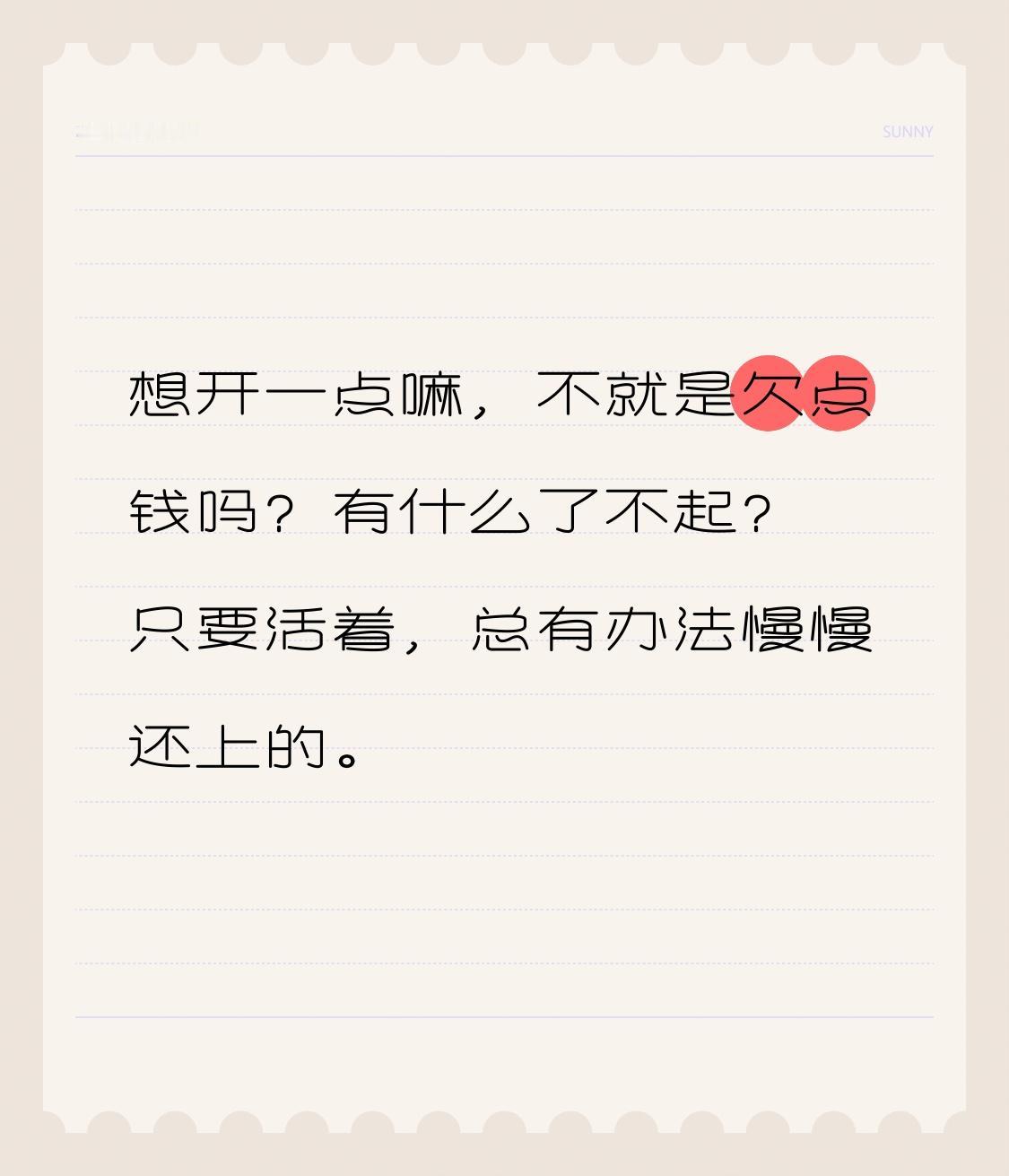 想开一点嘛,不就是欠点钱吗?有什么了不起?只要活着,总有办法慢慢还上的。我穷的时候买包盐吧都要欠帐!