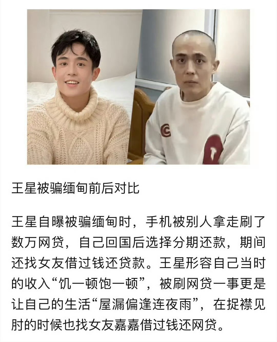 王星自曝在缅甸手机被人拿走刷网贷王星最大的功臣就是她女朋友,真是这辈子最大的福份,他之前和现在对比眼神完全变了一个人,更加精气神和帅气。