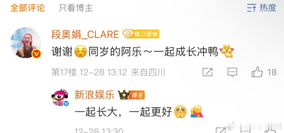 段奥娟记得和新浪娱乐同岁 段奥娟25岁生日,新浪娱乐也为她庆生,妹妹现身评论区回复:“谢谢同岁的阿乐,一起成长!”没想到她还记得和新浪娱乐同岁,顶顶好的妹妹!