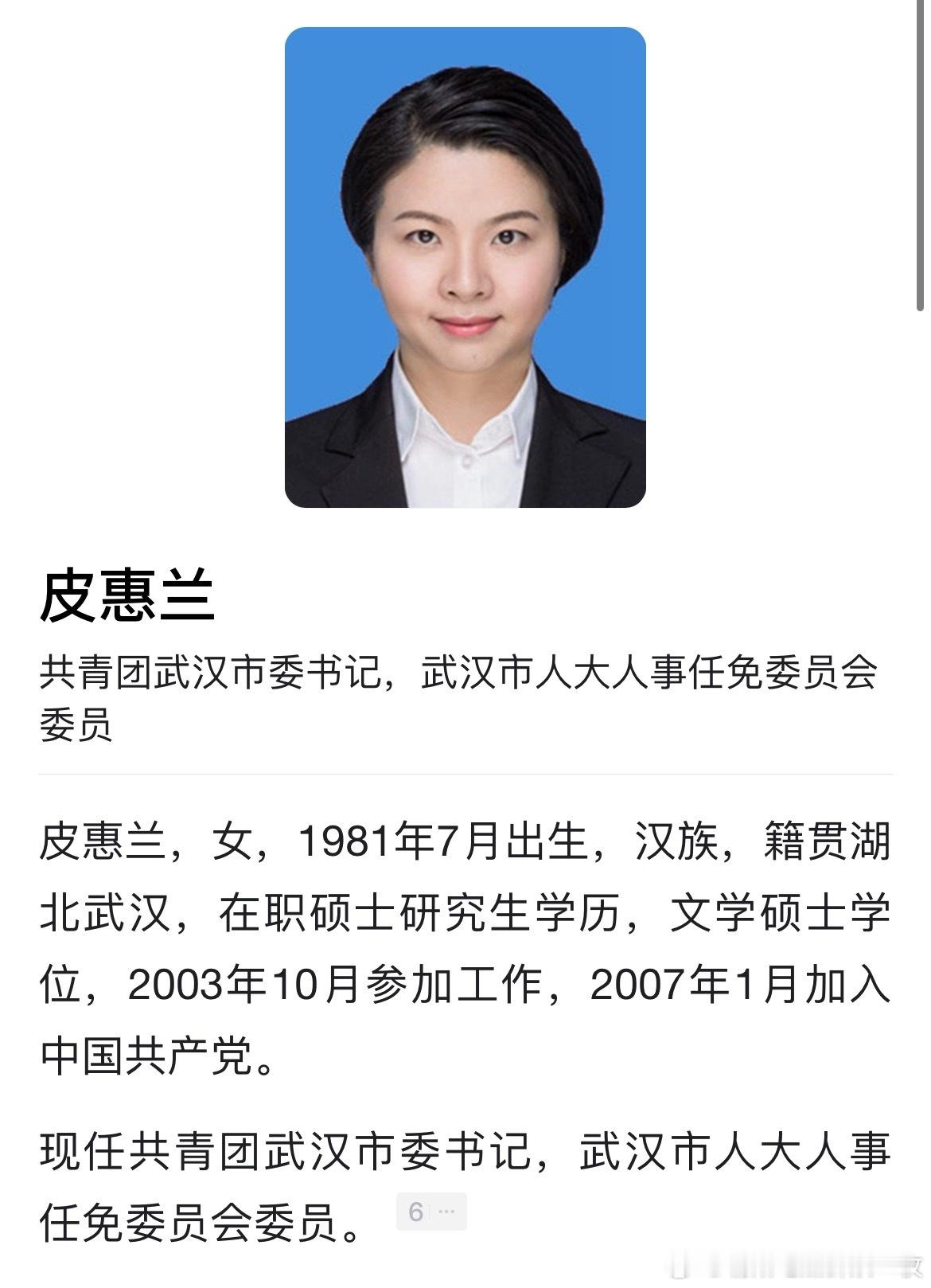 近 日,“武汉市委市直机关工作委员会”网站更新显示:原任共青团武汉市委书记的 皮惠兰,已任武汉市委市直机关工委分管日常工作的副书记。