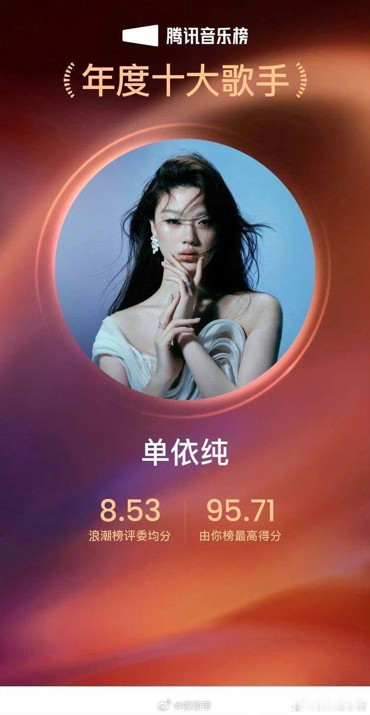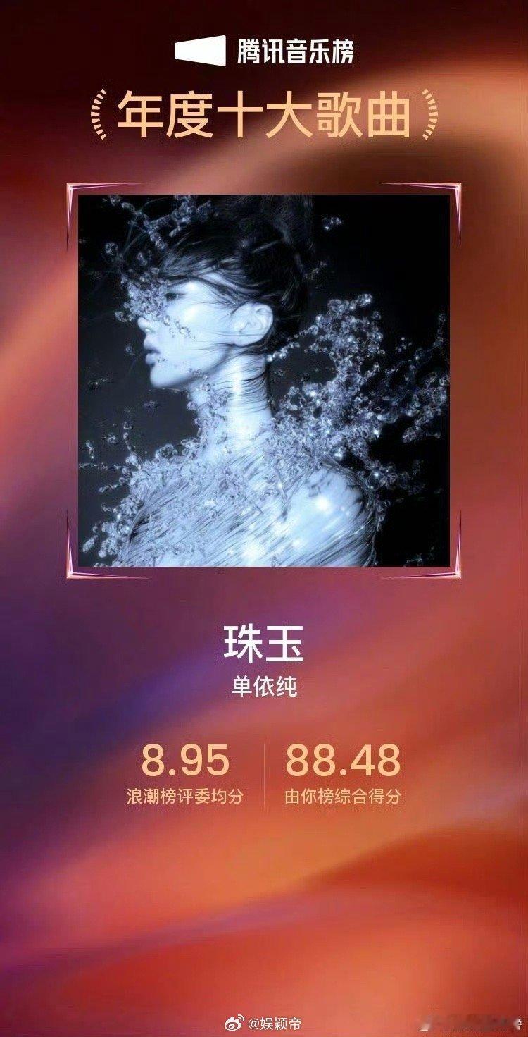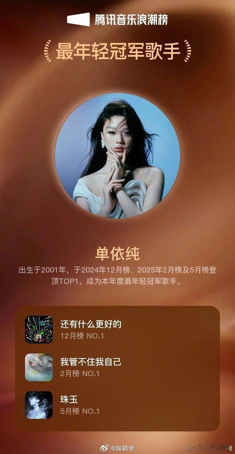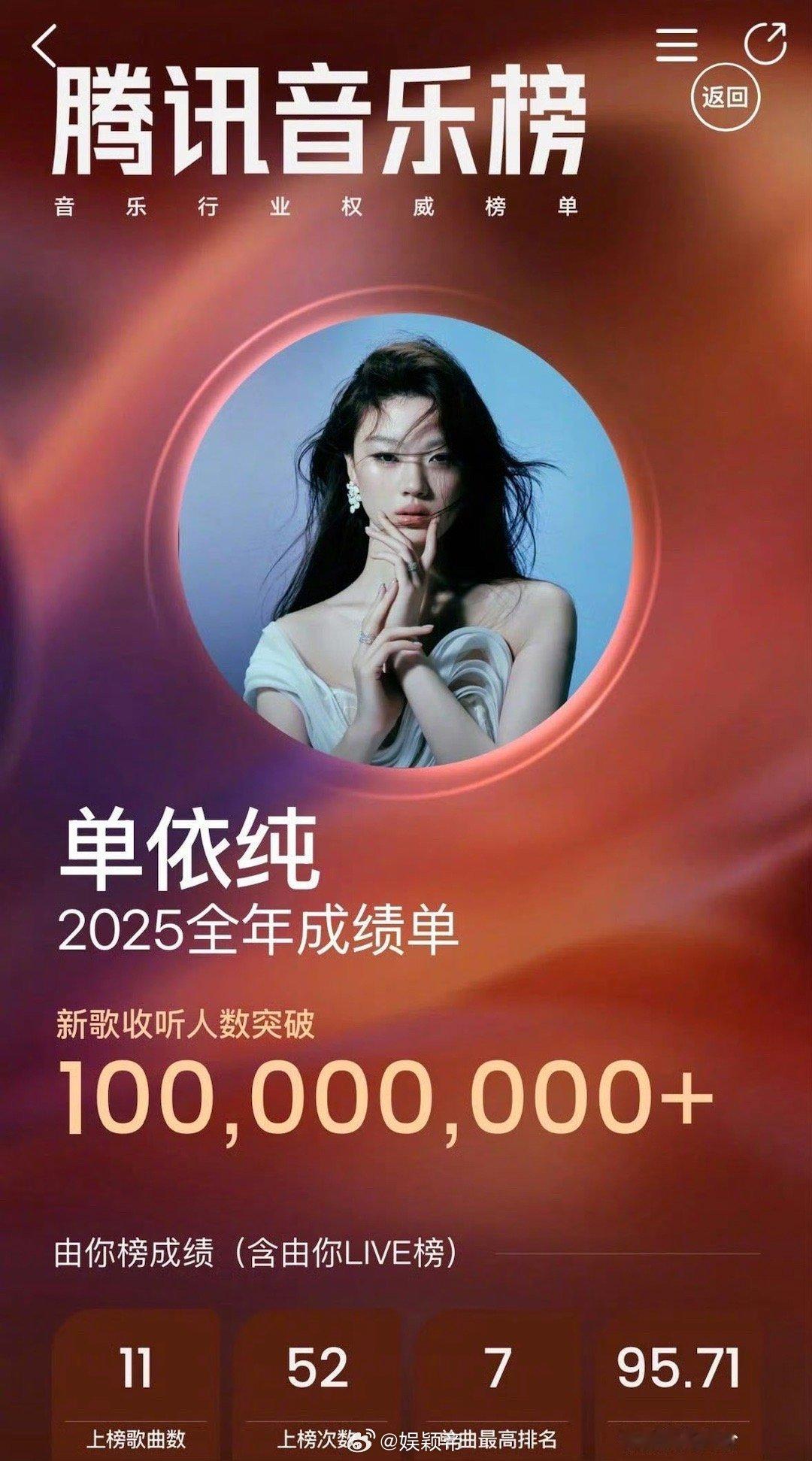 单依纯连续2年新歌收听破亿 连续两年新歌收听量破亿,这不仅是一份耀眼的成绩单,更是单依纯用实力书写的音乐答卷。她用《珠玉》《李白》等作品,完美演绎了艺术深度与大众喜爱的融合,一步步稳扎稳打,成为乐坛备受瞩目的实力新声。