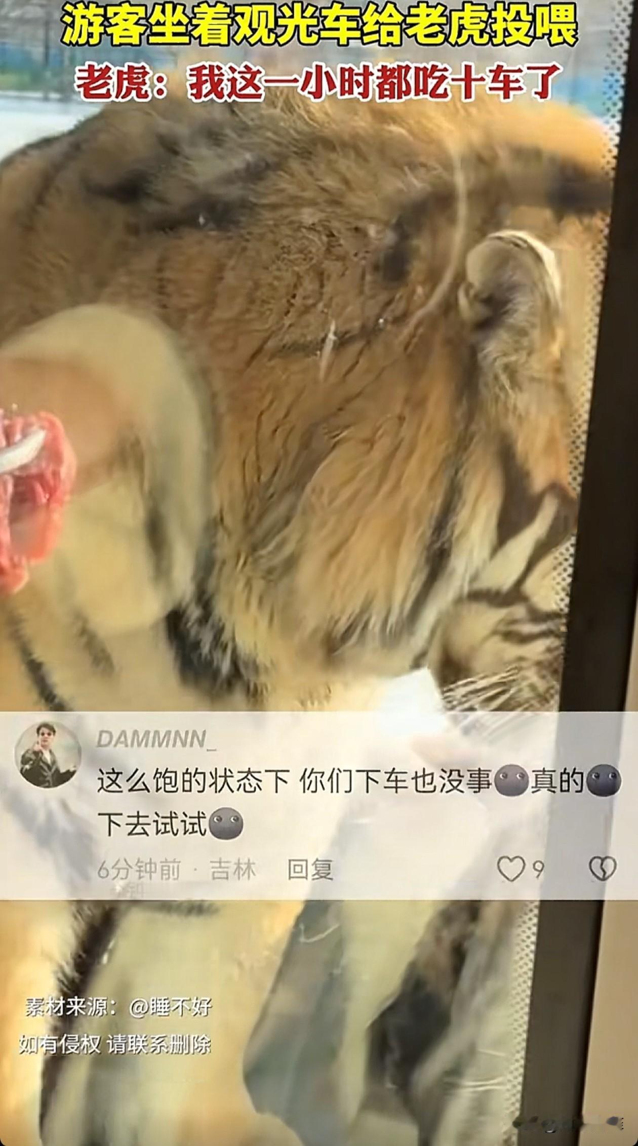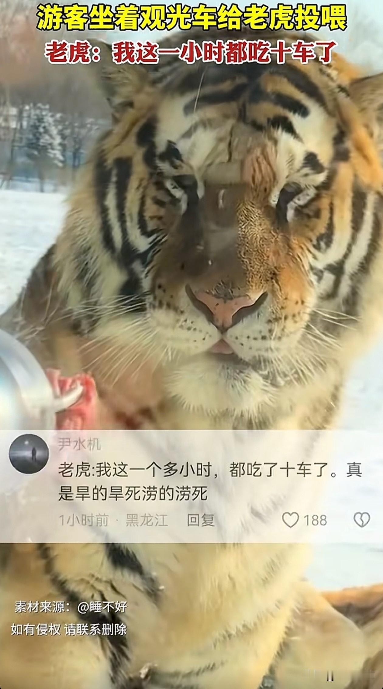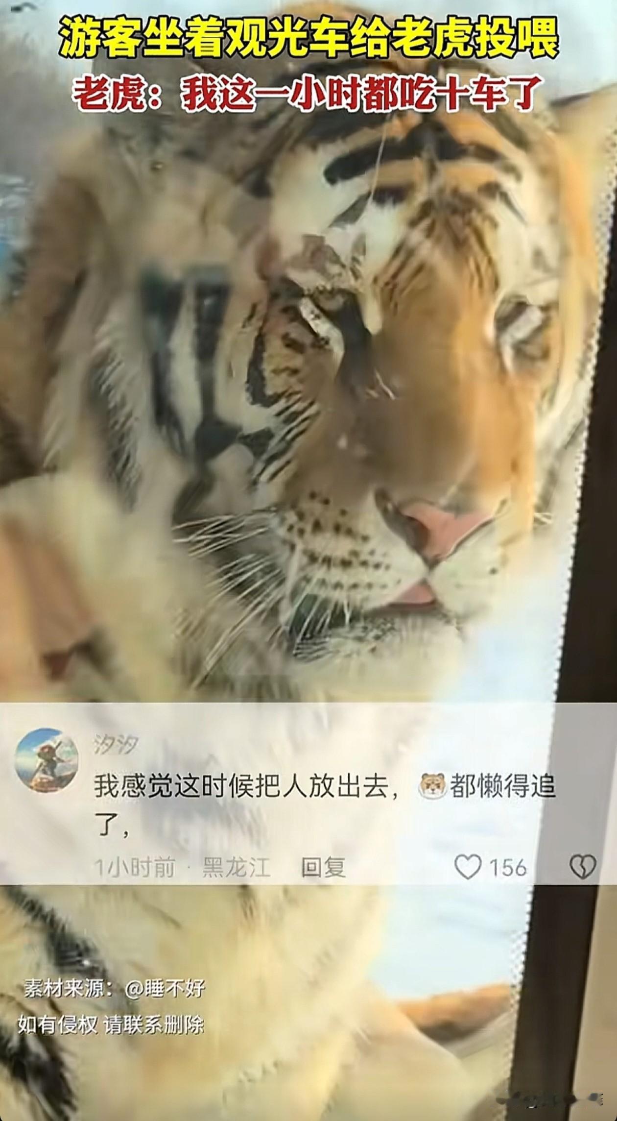笑不活了!黑龙江,一女子去东北虎林园看老虎,为了和东北虎互动,特意买了牛肉准备投喂,结果老虎看到牛肉后,竟然理都不理,直接转头,女子哭笑不得:它咋不吃呢?网友:吃腻了肉,想换素的。 女子坐观光车来进园后,兴奋地把牛肉从车窗的洞里伸出去,对着石头上的两只老虎晃了又晃,等着它们上来吃。 可没想到,一只趴着的老虎看都不看一眼女子递过来的肉,也不动弹,懒洋洋地晒着太阳。另一只蹲坐着的老虎,凑上去闻了闻牛肉的味,也立马把头扭到了一边,满脸冷漠。 更搞笑的是,女子一开始还不相信,又把牛肉往老虎嘴边递了递,这次老虎直接把头扭得更靠后,还一副嫌弃的小表情,好像在说:我不吃,谢谢。 女子举着牛肉僵在那里,一脸懵圈,转头问朋友:它咋不吃呢?朋友笑着说:估计是吃饱了,来这里的游客都太热情啦。 有网友调侃,此时此刻老虎可能更想吃西兰花,下次给它带点健胃消食片或者大山楂丸,比牛肉管用。再喂下去,老虎都要开始减肥吃沙拉了。 还有网友表示,以前的老虎追着车要东西吃,现在递到它嘴边都不想吃,真是风水轮流转,老虎:幸福是幸福,但确实是撑了,一点吃不下。 老虎不是凶巴巴的拒绝,是慢悠悠扭头,连一点脾气都没有,像个撒娇耍赖的大猫,彻底打破了老虎很凶的刻板印象,又萌又可爱。 女子虽然有点着急,但也没有强行投喂,只是默默举着肉,这份温柔也让画面变得美好,有趣又治愈。