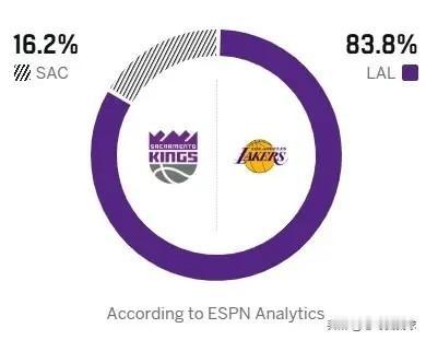 ESPN真是太看得起湖人了!明天湖人将会在主场迎战由威斯布鲁克领衔的国王,今天ESPN对于明天这场焦点战进行了一番预测,结果真是让人大吃一惊,ESPN预测湖人的赢球概率高达83.8%,基本上提前宣告了湖人的赢球。 在我看来,虽然湖人在整体实力方面强于国王,但是我们千万不能忽视一名关键球员,那就是威斯布鲁克。众所周知,每当威少面对旧主湖人的时候,他都会打出非常精彩的表现,我相信威少一定会带领球队在客场击败湖人。