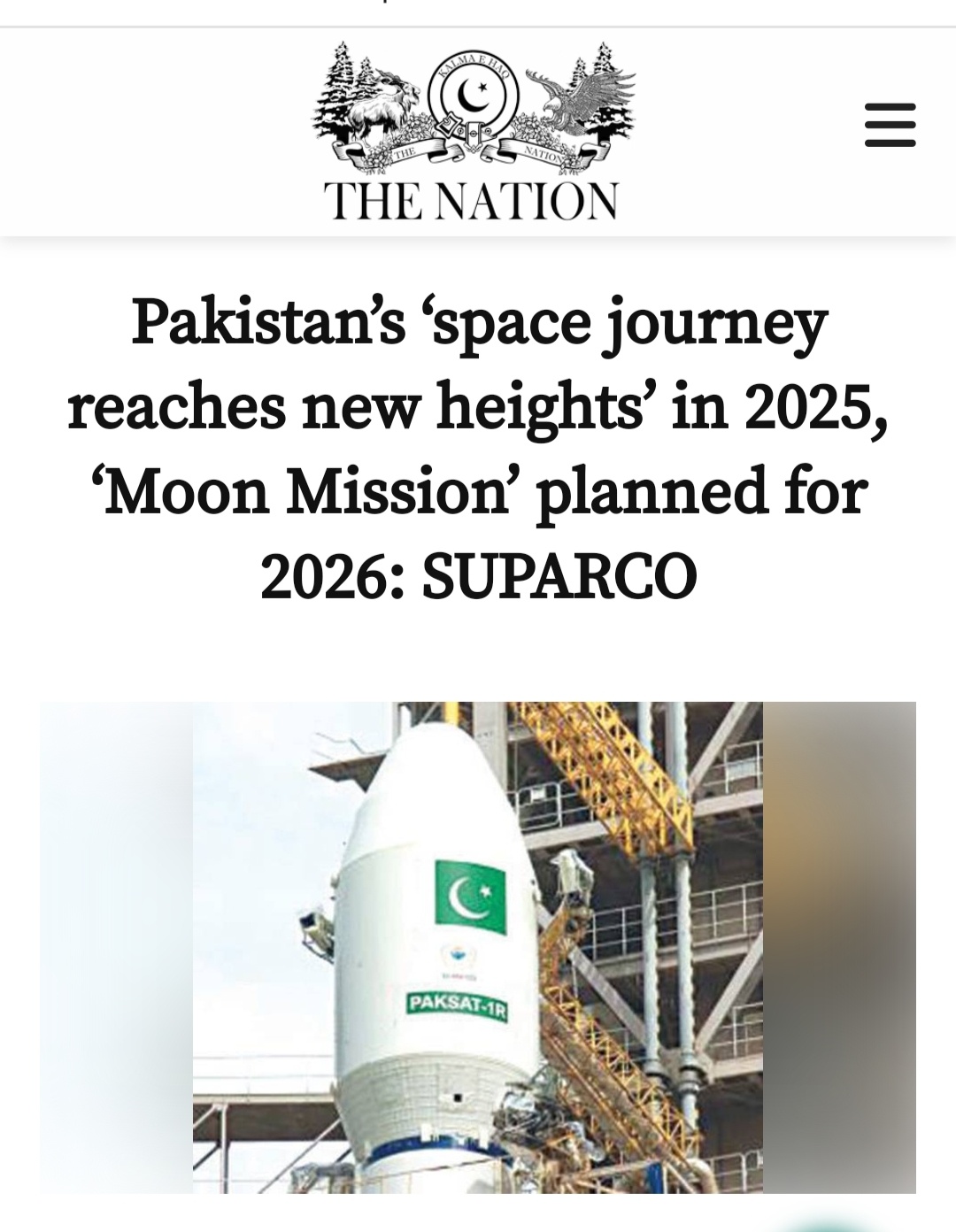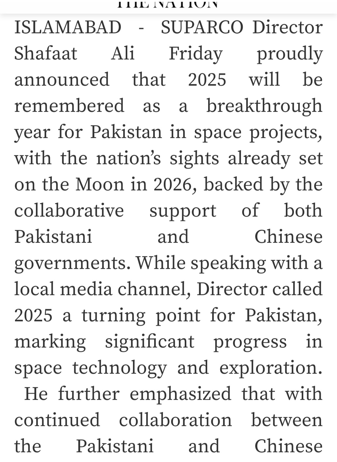 【巴基斯坦航天员2026年造访中国空间站】巴基斯坦航天与外层空间研究委员会主任沙法特·阿里 12月26日接受当地媒体采访时透露2026年航天计划;2025年将是巴基斯坦航天项目取得突破性进展的一年,巴基斯坦已将目光投向2026年的月球,并计划在巴基斯坦和中国共同支持下实现这一目标。2025年是巴基斯坦的转折点,标志着巴基斯坦在航天技术和探索领域取得了显著进步。他进一步强调,随着巴基斯坦和中国的持续合作,巴基斯坦将在2026年实现登月壮举。他还表示,到2026年底,巴基斯坦将向中国空间站派遣首位航天员,这一历史性成就不仅将展现巴基斯坦日益增强的太空能力,还将加强其与中国在突破性科学探索领域的伙伴关系