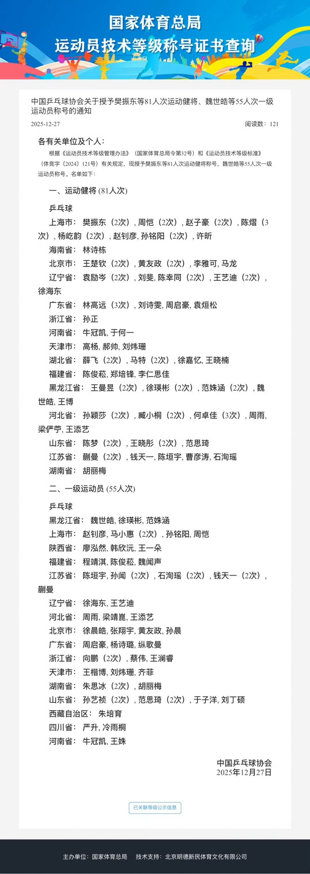 樊振东王楚钦孙颖莎被授予运动健将中国乒协发布通知:授予81人次运动健将称号,55人次一级运动员称号。乒乓球运动健将:河北省 孙颖莎(2次)🎉