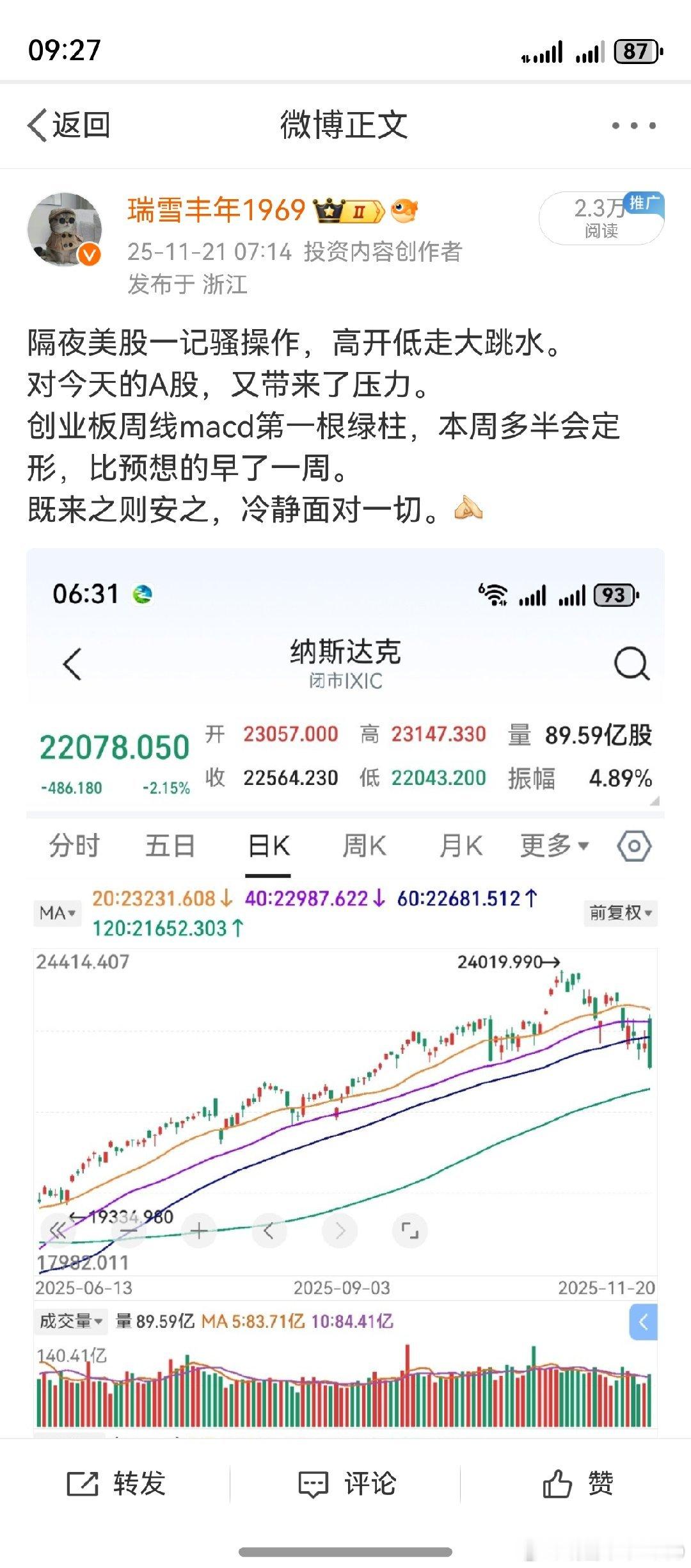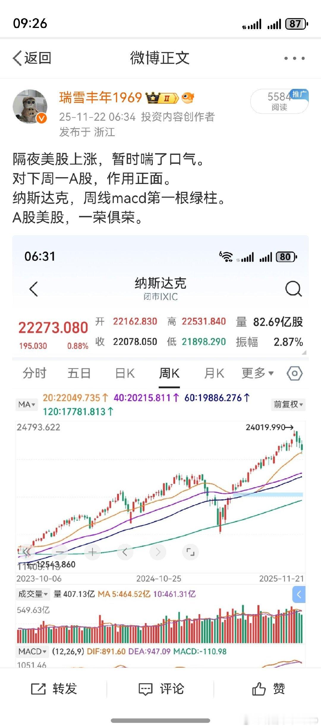 “macd第一根绿柱战法”,大前提是经典k线组合和均线系统排列。下级服从上级,次序不能颠倒。11月21日,周五,创业板一记大跌,周线第一根绿柱提前出来了。早跌早轻松,由此,上涨也提前了。回顾一个多月来的微博,老鸭比较欣慰。因为有技术面作支撑,所以始终坚定信心。多学点有效的技术,绝对不是坏事。
