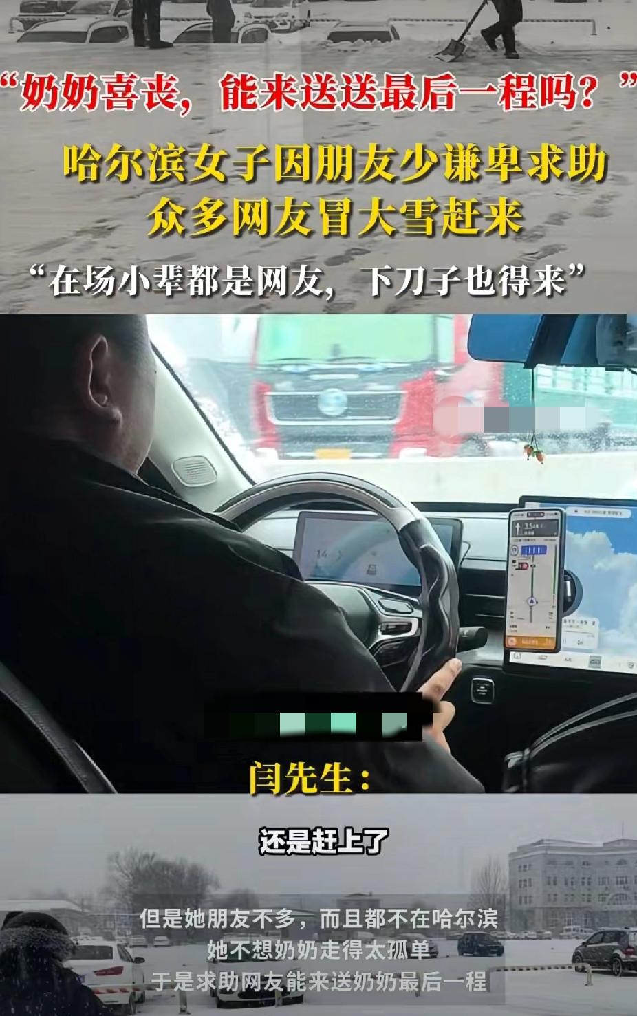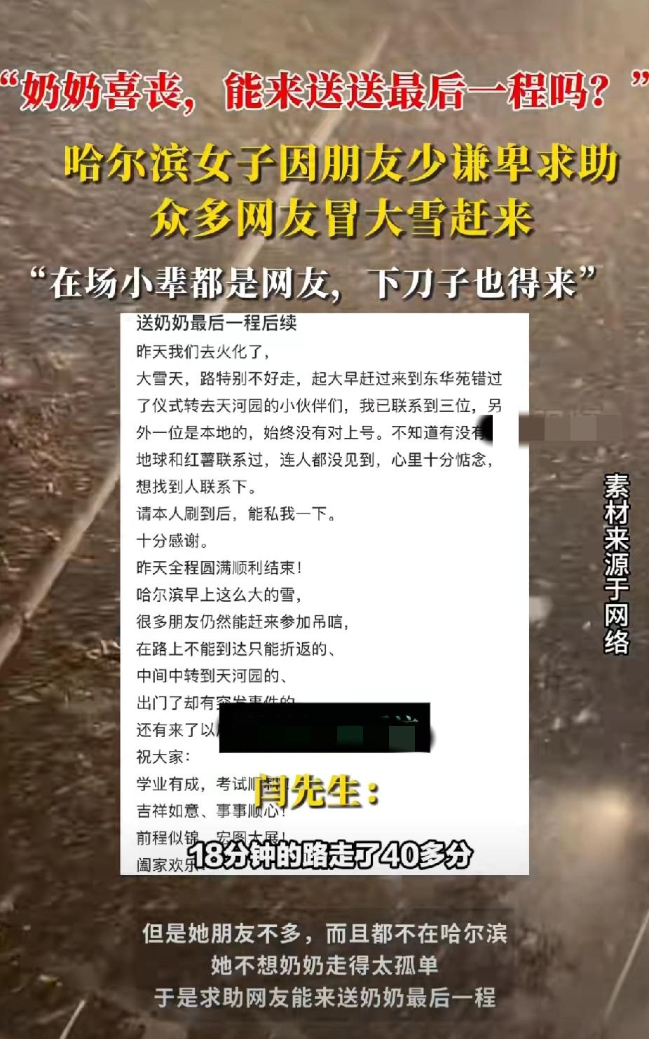 哈尔滨这场暴雪里的“网友奔现”,把喜丧办成了最暖的局! 谁能想到,社交平台上一句朴实求助,竟让哈尔滨的暴雪都变温柔了!“奶奶90岁喜丧,我朋友不多,能不能有人来送她最后一程?”哈尔滨女子的这条求助,没有华丽辞藻,却戳中了无数人的心。 本是怕奶奶走得孤单,没想到数千网友秒回应,更有一群人真的冒雪赴约!浙江游客小情侣特意调整行程,提前订好殡仪馆附近酒店,大雪拍脸生疼、打车打不到,就算赶去殡仪馆时老人已送往火化场,也二话不说打车追了十公里 。本地网友闫先生连续加班三天,凌晨三点到家还硬撑着不睡,导航18分钟的路在雪地里开了40多分钟,就为了兑现“说出去的话在东北能结成冰”的承诺。 当天三四十位网友准时到场,有大学生、上班族、游客,还有人堵在半路徒步赶来。大家素不相识,却整齐地给奶奶鞠躬默哀,陪着家属送最后一程,仪式结束不少人顾不上吃席就赶去上班。女子后来给浙江情侣寄去沈阳旅行用餐券,东北人的实在遇上网友的热心,双向奔赴太好哭了! 都说现在人情淡了、网友都是“云交情”,可这场喜丧狠狠打脸!90岁奶奶高寿离世本是喜事儿,网友们用行动告诉姑娘:你不是一个人,奶奶也绝不会孤单。暴雪挡得住交通,却挡不住善良和承诺。 你被这场跨越陌生的温暖打动了吗?如果是你,会为素不相识的人冒雪赴约吗?评论区聊聊你的看法,一起为这些热心人点个赞,让正能量传递下去!哈尔滨暴雪里的人间温情 网友双向奔赴的善意 喜丧不孤单
