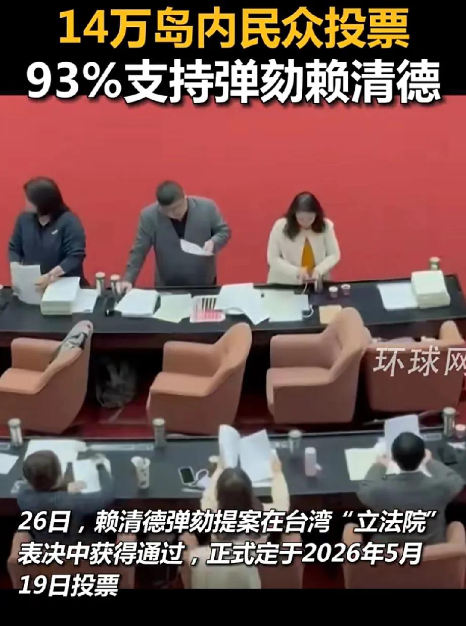 这是首次! 这是历史性首次! 这是统一台湾民心向背首次! 12月27日,对“赖清德下台”进行台湾民意投票的结果说明: 93%的台湾民意要求台独分子赖清德下台! 要知道: 这是首次! 这是历史性首次! 这是统一台湾民心向背首次! 在高市早苗拿整个日本押注军国主义,在美国对台不管死活的最后一次巨额军售的大背景下: 赖清德派系依美依日的历史已经非常现实地成为了遗臭万年的历史垃圾。 如果再不反省,再进行顽抗,那么解放军将成为解决问题的唯一选择!