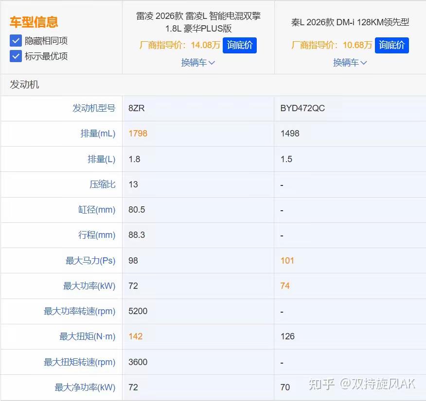 刚刚上市的改款雷凌/卡罗拉,1.8L油混版WLTC综合油耗百公里4.19L,1.5L插混的秦L,WLTC亏电油耗百公里3.98L。 秦L的整备质量比雷凌L重了近400公斤,撞风面积比雷凌L大,轮胎比雷凌宽(225mm对205mm),占了三个debuff的情况下,亏电油耗竟然还比雷凌L低了5%,确实让人挺意外的。而且秦L在排量少0.3L的前提下发动机功率和丰田的1.8L相当。【来自懂车帝车友圈】