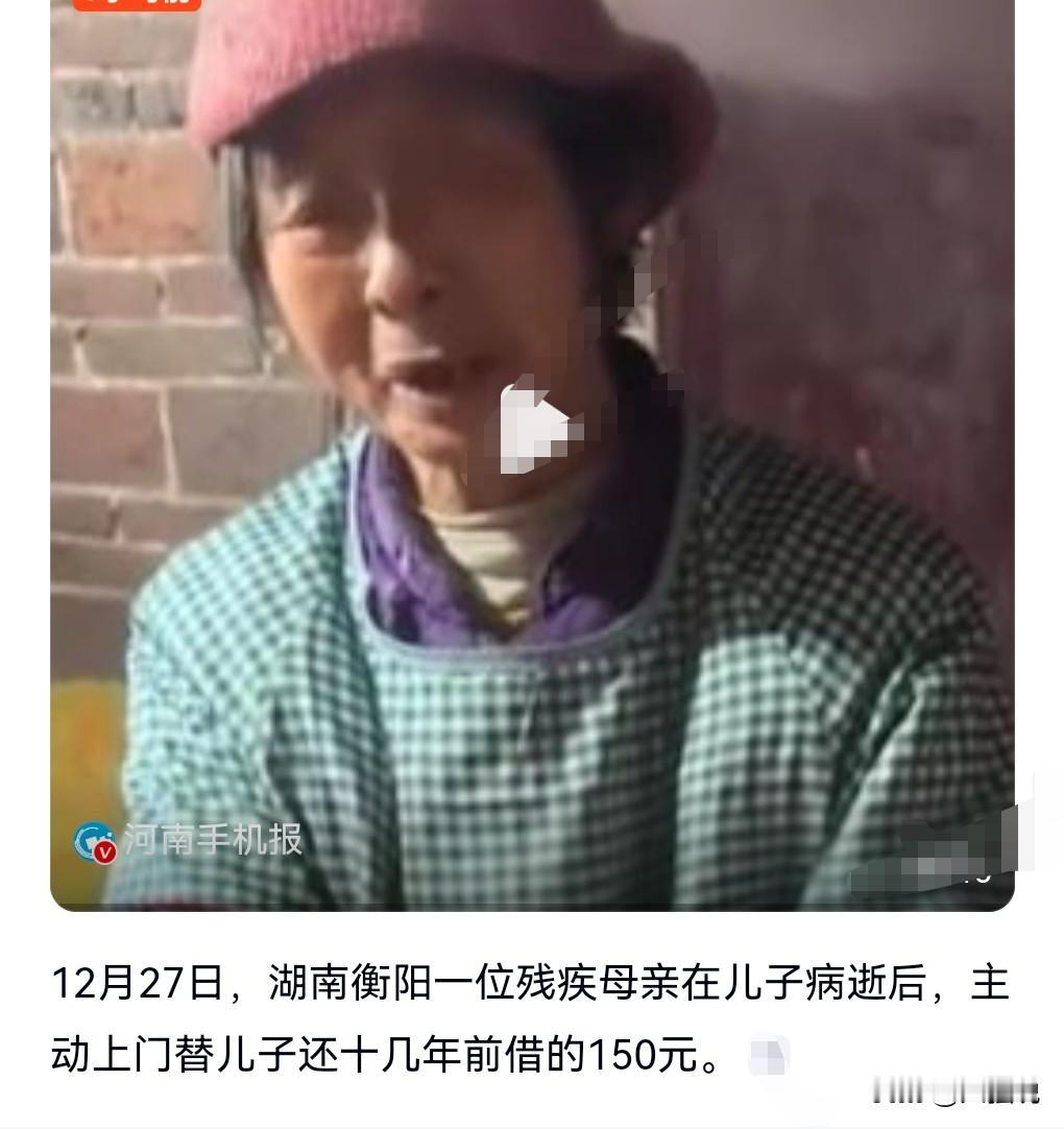 诚信在这个社会上是相当的宝贵的。 12月27日报道,湖南衡阳,儿子病逝,残疾母亲替其还150元欠款。 这笔钱本来可以不用老人家还的,毕竟是她儿子借的钱。 但这个老人选择还。 这就是一种诚信,而且是替儿子,还更是非常好的人品。