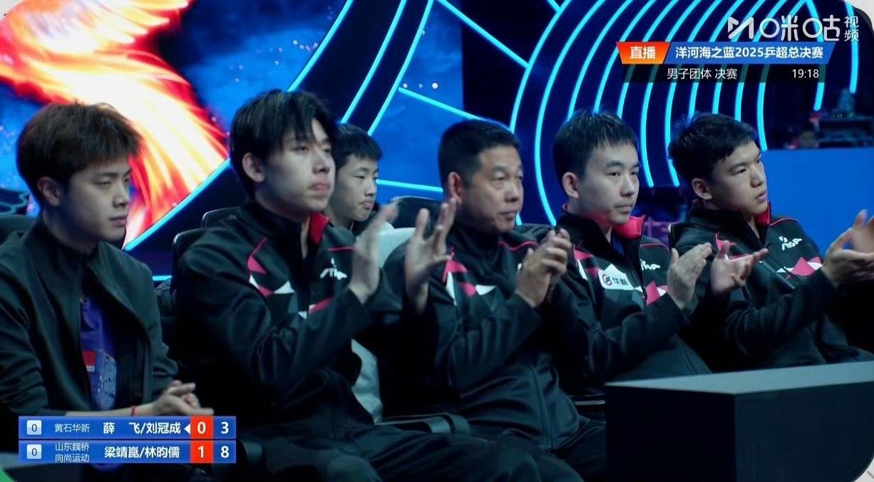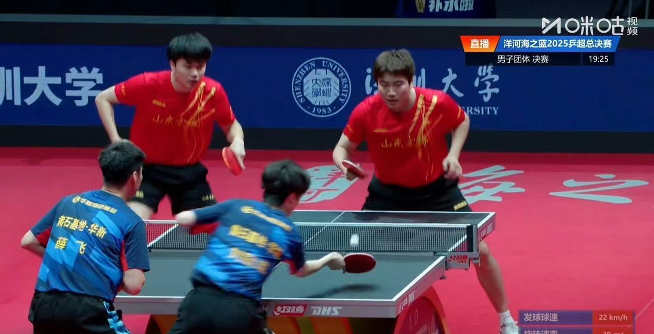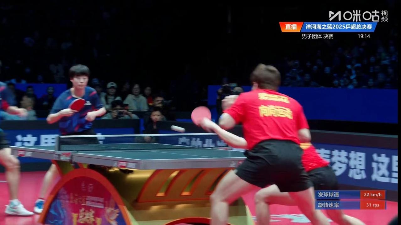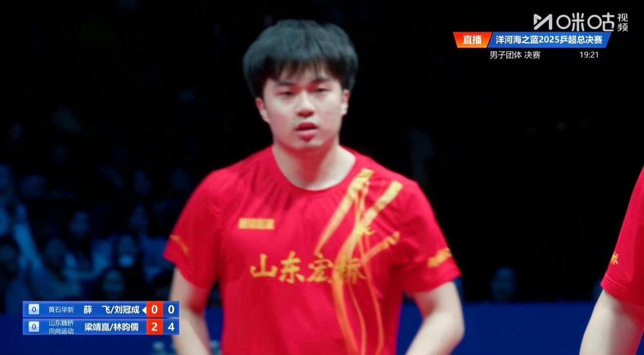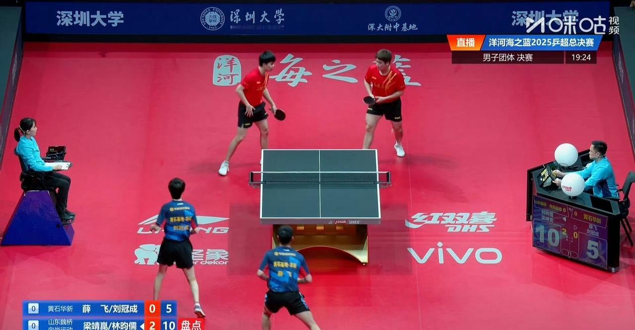 薛飞/刘冠成也是尽力了, 无奈梁靖崑/林昀儒配合太好, 第一盘前两局梁靖崑/林昀儒11-1,11-4先胜薛飞/刘冠成! 打得太快了,第三局梁靖崑/林昀儒又11-5,彻底完胜第一盘。 这是2025年乒超联赛总决赛男团决赛,目前黄石基地0-1落后于山东魏桥。 第二盘:向鹏🆚王楚钦[奋斗]!