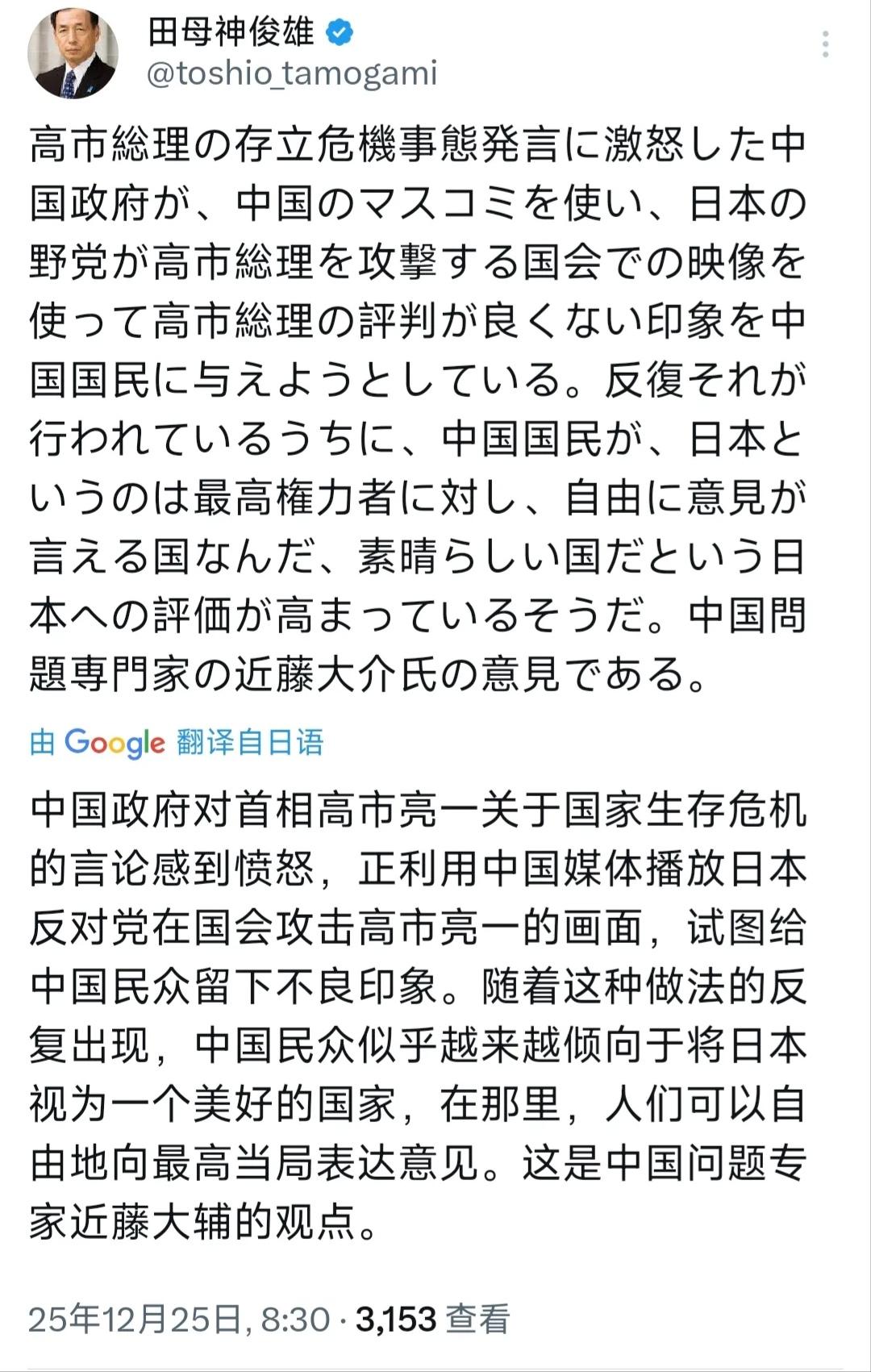 日本航空自卫队前参谋长田母神俊雄12月25日发文写道:“中国政府对高市首相关于国家生存危机的言论感到愤怒,正利用中国媒播放日本反对党在国会攻击高市早苗的画面,试图给中国民众留下不良印象。随着这种做法的反重出现,中国民众似乎越来越倾向于将日本视为一个美好的国家,在那里人们可以自由地向最高当局表过意见,这是中国问题专家近藤大介的观点”。 近藤大介所谓是中国问题专家,所发表的观点与中国的真实情况大相径庭、毫不着边,真可以称之为“伪专家”。特别说中国民众对中国媒体批判高市早苗的“涉台言论”后“视日本是美好国家”,更是无稽之谈,倒是更像是“黄婆卖瓜、自卖自夸”。 高市早苗发言的“台湾有事言论”,严重干涉中国内政,严重侵犯中国主权,严重破坏中日关系的政治基础。引起中国人民极大愤慨,高度一致的表达出极度不满。近一点近藤大介如果真是时常关注中国的问题专家,在中国互联网上应该完全可以看出,中国网友的对高市言论不满的真实情况。 其实,近期高市发表“涉台言论”后,大量的中国民众愤怒的拒绝到日本旅游,直接严重打击日本旅游业,还造成未来两周中日46个航班全部取消,这才是中国民众的真实态度。可以说如果高市早苗不撤回挑衅中国的言论,中日关系难以改善。而近藤大介所谓中国的“问题专家”就不要发表些自欺欺人、自卖自夸、毫不着边的言论去忽悠日本民众了。